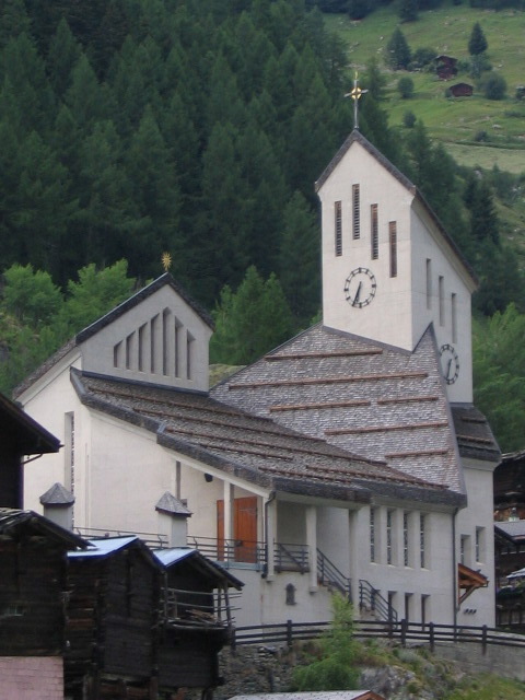 Blatten in the Lötschental has a new (built 1985), modern-style church which somehow harmonizes well with the rest of the village despite its very different form (59). It is also beautifully designed on the inside (60).