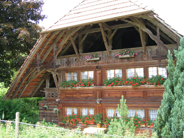 As one might expect, although there is strong architectural unity in the Emmental, exceptions do exist. The picture below shows a house in Langnau that is Blockbau and looks almost entirely non-Emmentaler. It appears to be very old, given the condition (dark and slightly graying) of the wood. I would love to know about this house's origins. I'd never guess without prior knowledge that it was an Emmentaler building.