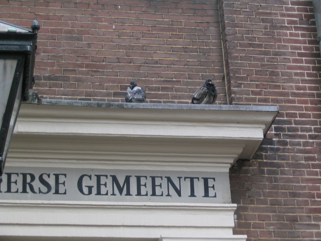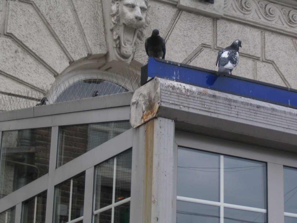 The lion is just reaming the pigeons out for their lack of hygiene, but he can't make any sound, so they don't notice. (This is the Park Plaza Victoria at the north end of the Damrak, where it meets the Prins Hendrikkade.)