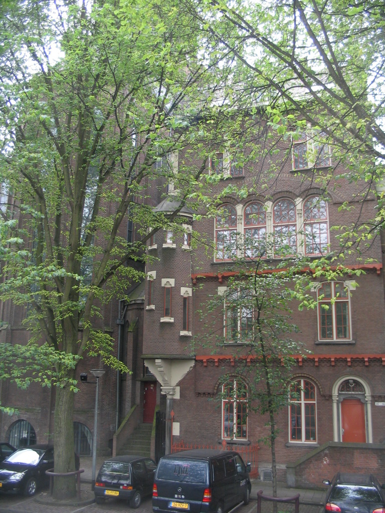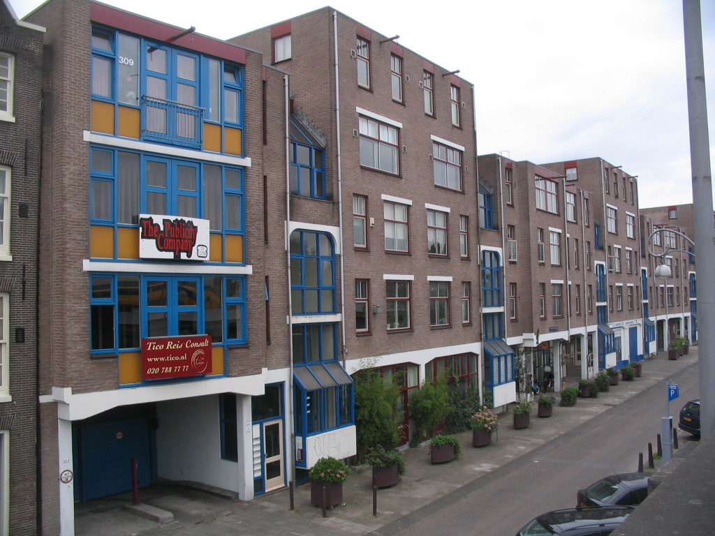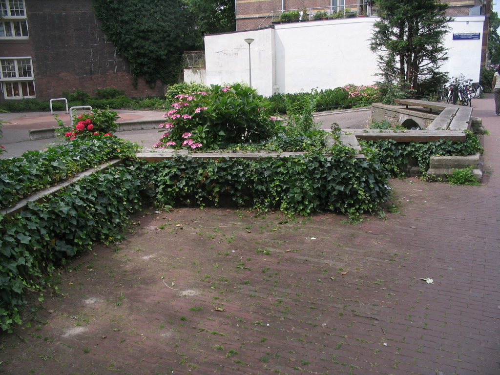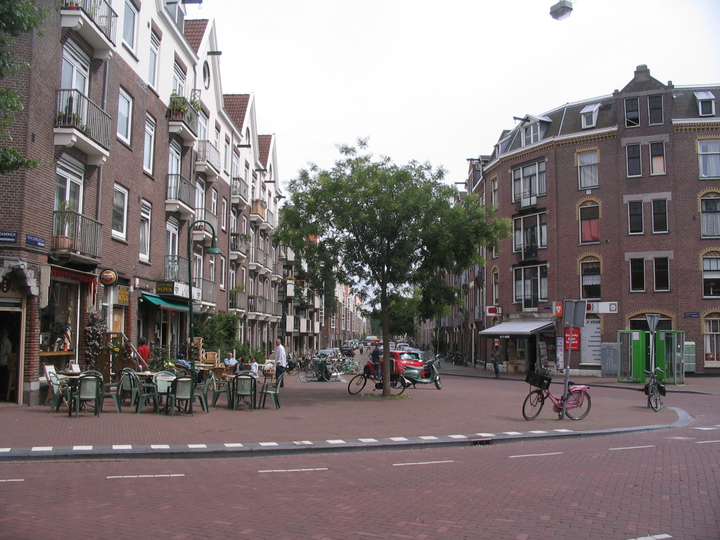 A pleasant plaza at the corner of Spaarndammerstraat and Nova Zemblastraat, distinguished from the streets only by the curb boundary. (In case you're wondering, yes, that does refer to Novaya Zemlya, I'm certain of it — other streets in this neighborhood include Spitsbergenstraat, Nordkaepstraat, Stavangerweg...)