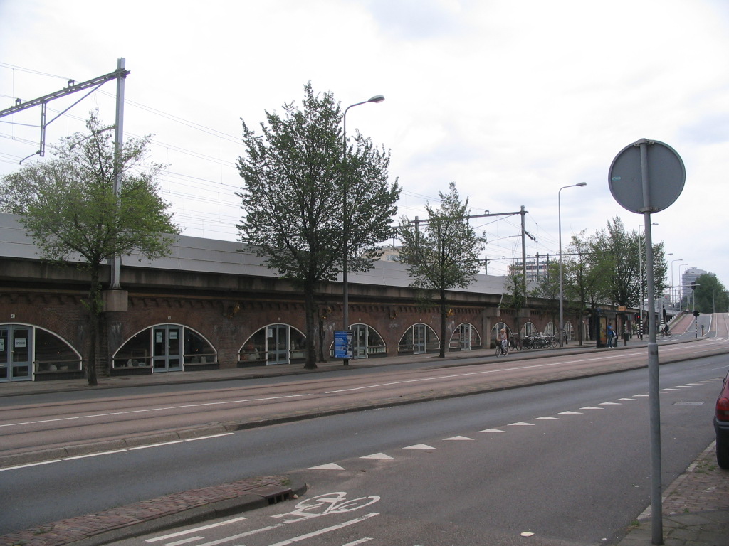 Now this is a fascinating bit of infill that is unique among the places I've been, as far as I can remember: the space underneath the railroad enclosed and turned into shops. It appears to be aptly named Tussen de Bogen (Between the Arches). A really cool idea — I often think of how much potential there is for the unused space underneath elevated highways and the like. I just wonder how well insulated the interiors here are from the vibrations of the trains!