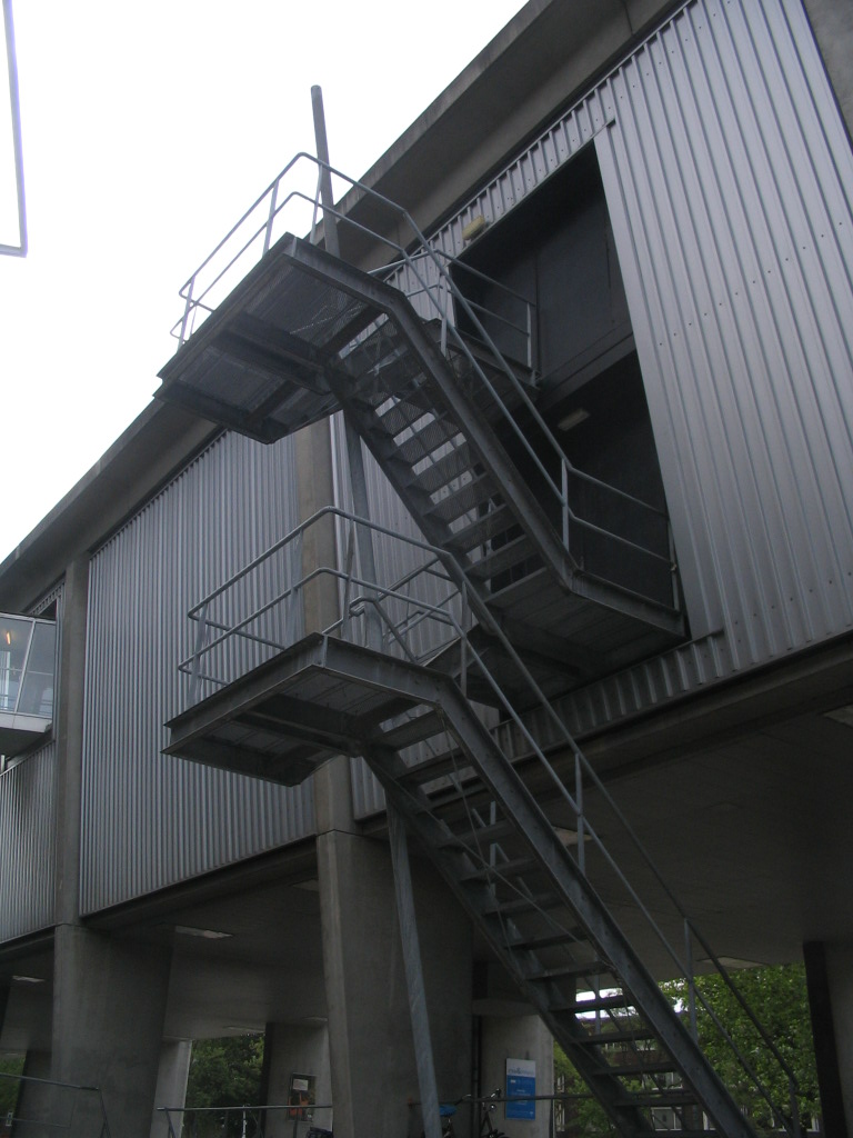 The archive wing's fire escapes are certainly consonant with the industrial look of the rest of the wing.