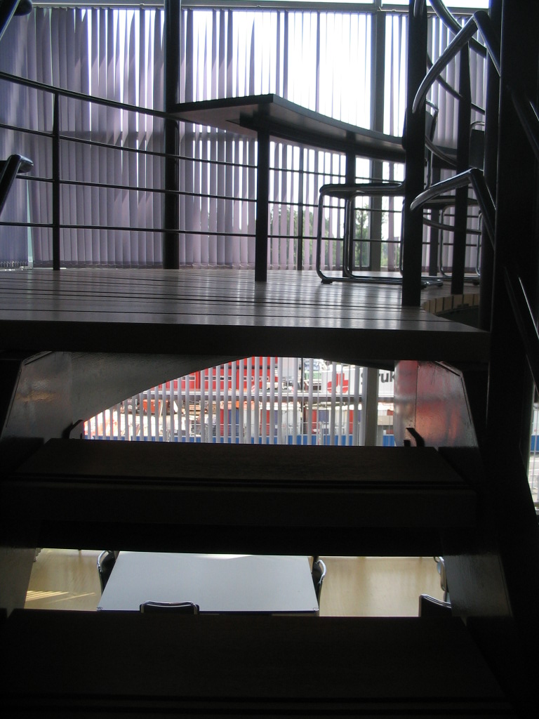 On the glass box's upper levels are study areas. Here, an open stair up to the highest level.