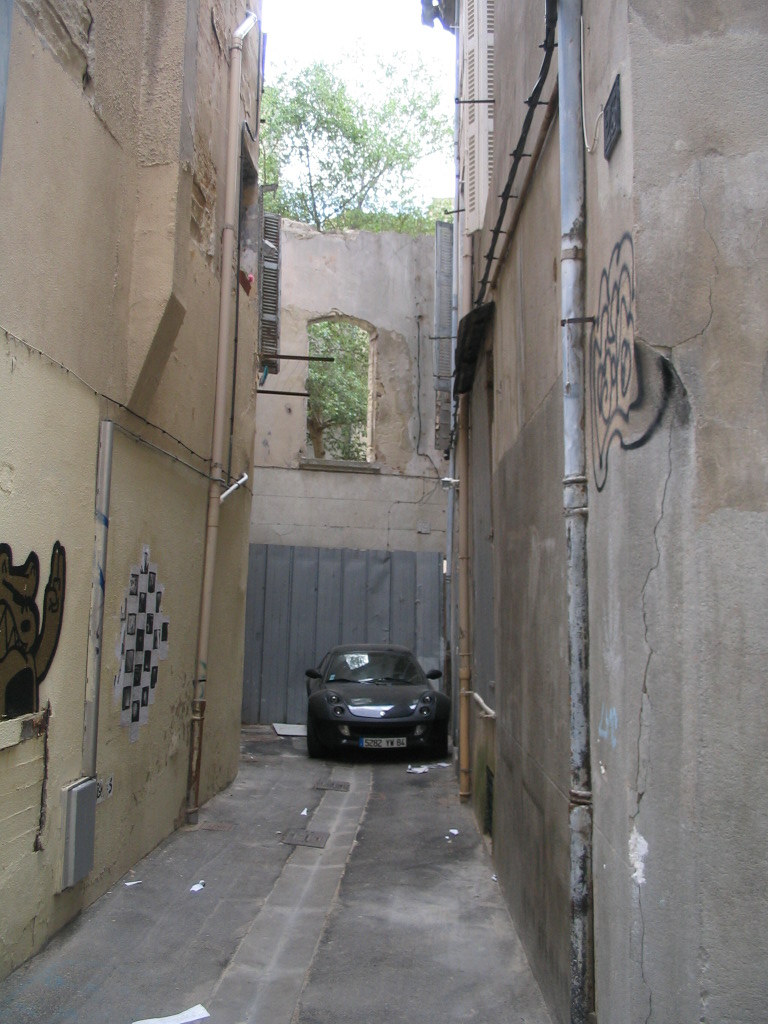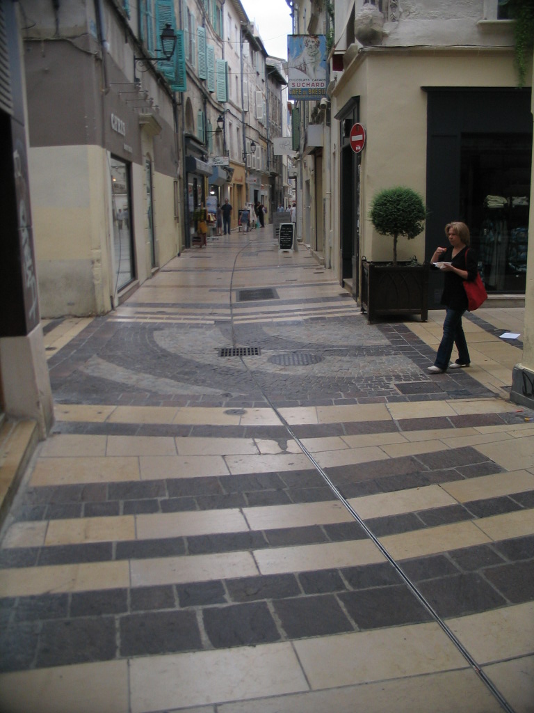 Diagonal pavers leading between the jagged edges of Rue Rappe from the Place du Changé. Also interesting to keep seeing these metal expansion joints in the middle of the street.