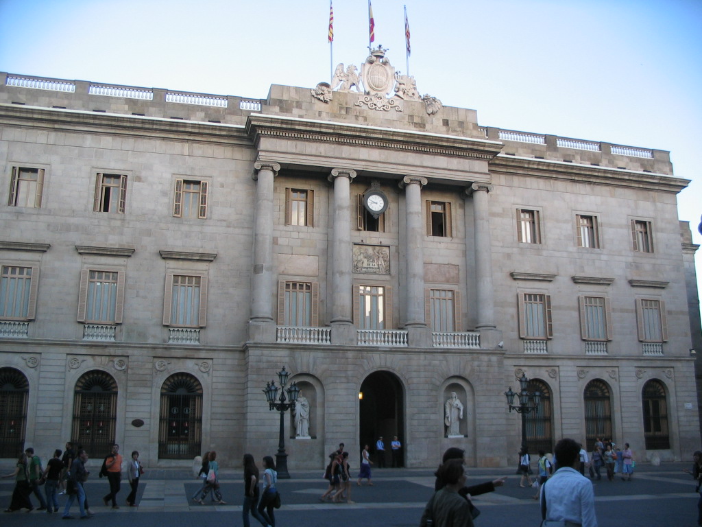 Further along is the central square of the old city, Plaça Sant Jaume. Here the Ajuntament (city hall) and the Palau de la Generalitat de Catalunya (seat of the Catalan government) face each other across the square. Pictured is the Ajuntament.
