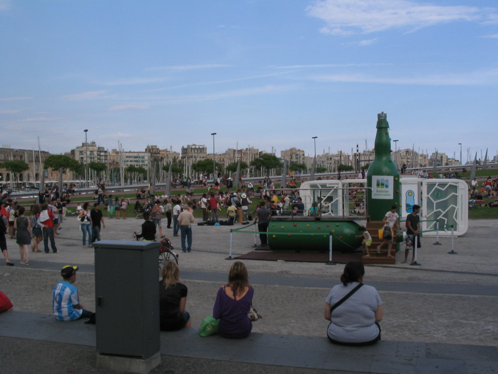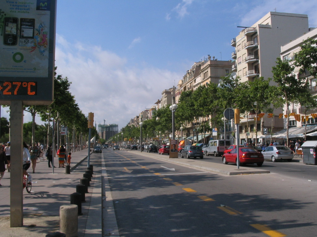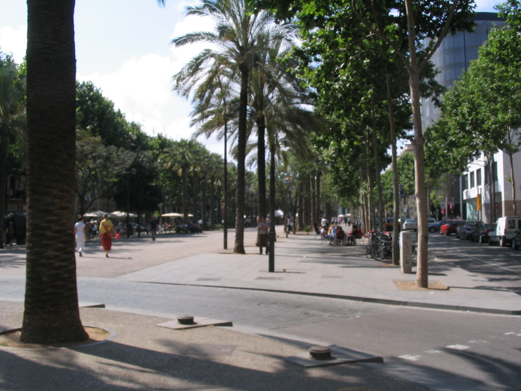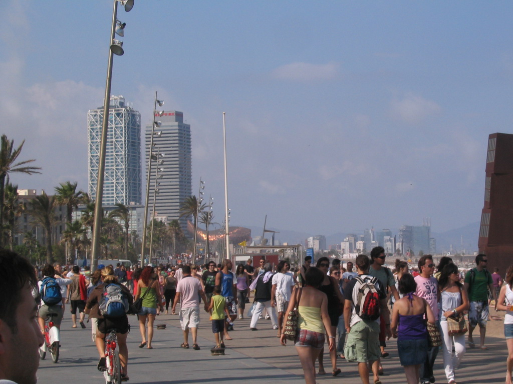 Summery times along the Passeig de Joan de Borbó after rounding the corner and turning southeast toward the beach. To the right is Barceloneta, a distinctive old fishing district projecting into the sea, with extra-narrow orthogonal city blocks.