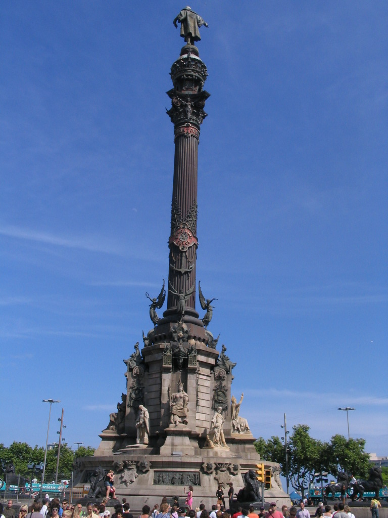 At the lower end of Las Ramblas, at the edge of the Ciutat Vella, is the monument to Christopher Columbus, who met Ferdinand and Isabella in Barcelona upon return from his first voyage to the New World. I like how people climbing up along the base augment the statues above.
