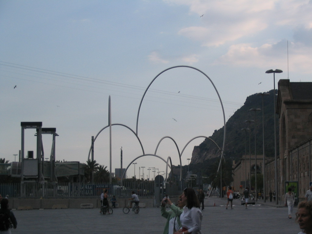 At Plaça Drassanes, the iconic poly-arch, with the seaward cliff of Montjuïc beyond.