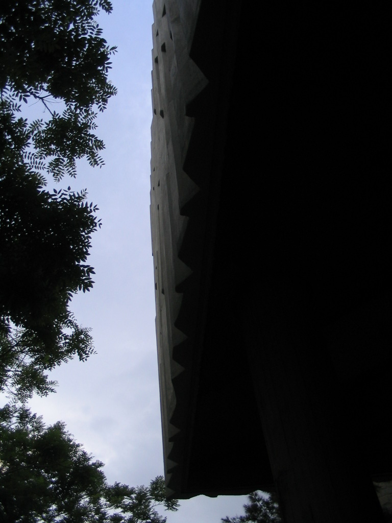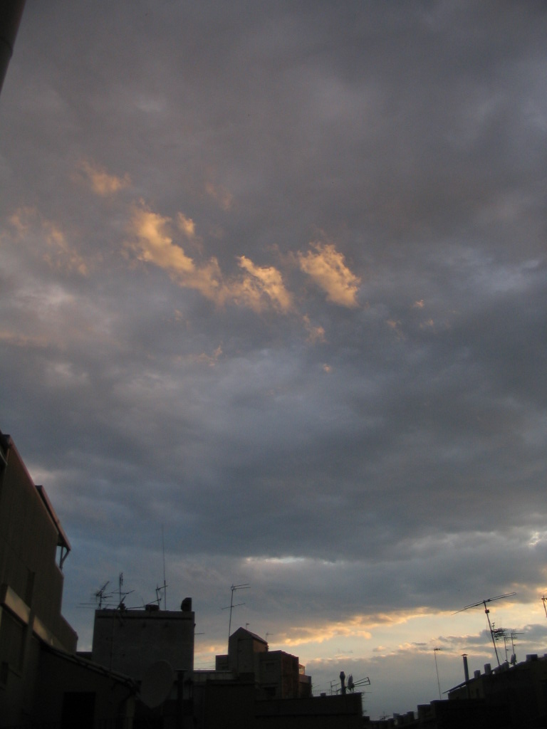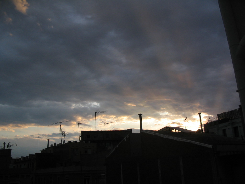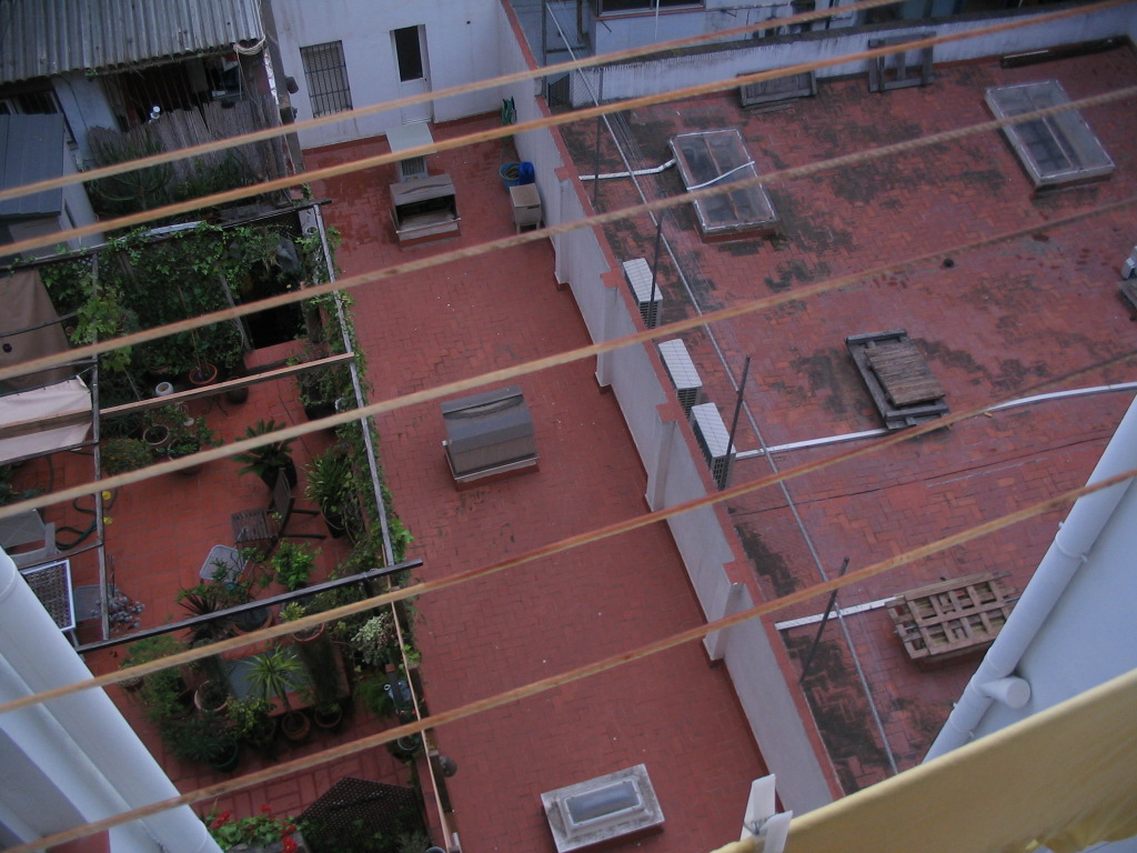 Down to the terrace below the back window, looking through the clotheslines that we used to dry off our clothes after washing them. The whole block is solidly built, but with radically variable building heights. I forget whether we had a washer or had to hand-wash clothes (I'm thinking we did have a washer), and I also forget whether clothes were possible to retrieve if they fell from these lines!