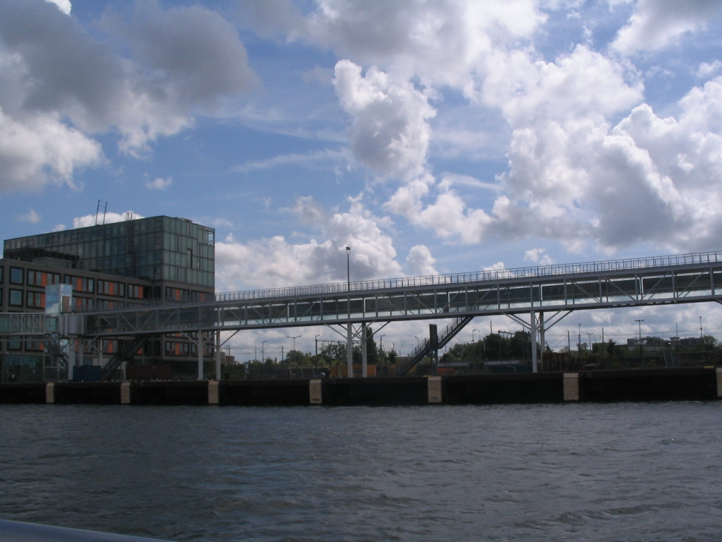 An intense footbridge, with both enclosed and open levels, along the south shore of the IJ, in the area near Veemkade (kade means quay or wharf).