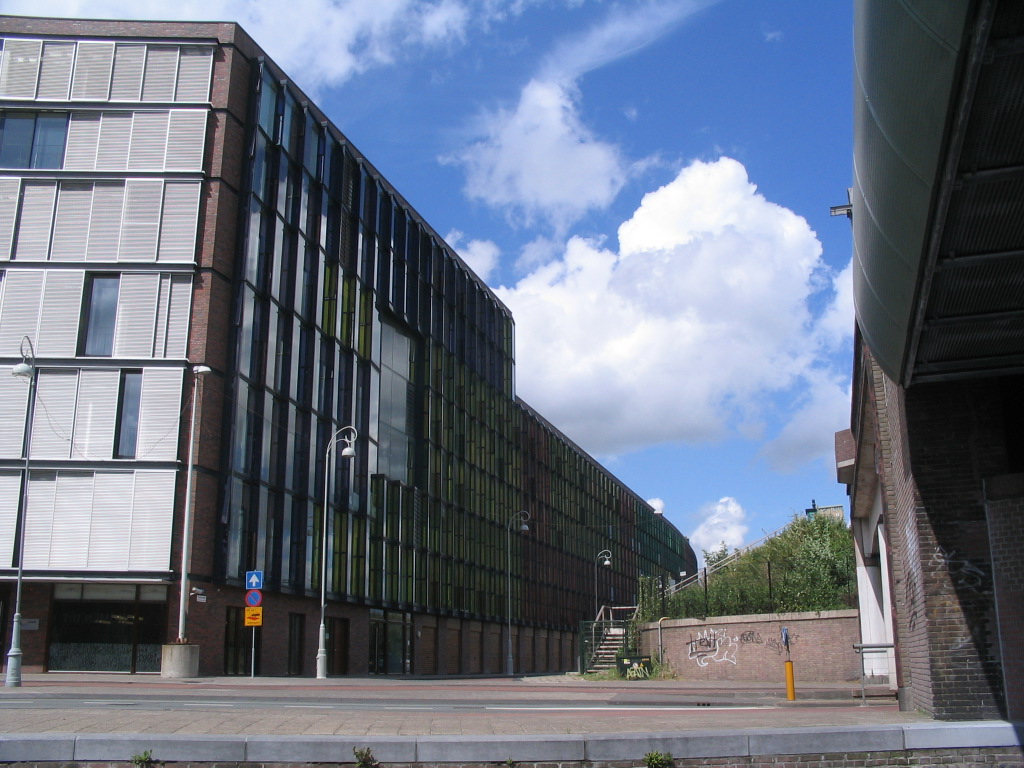 Note the colored glass slats on the receding façade at left, just barely visible in this light, looking up Keerwal west of the railroad bridge, along Cruquiuskade.