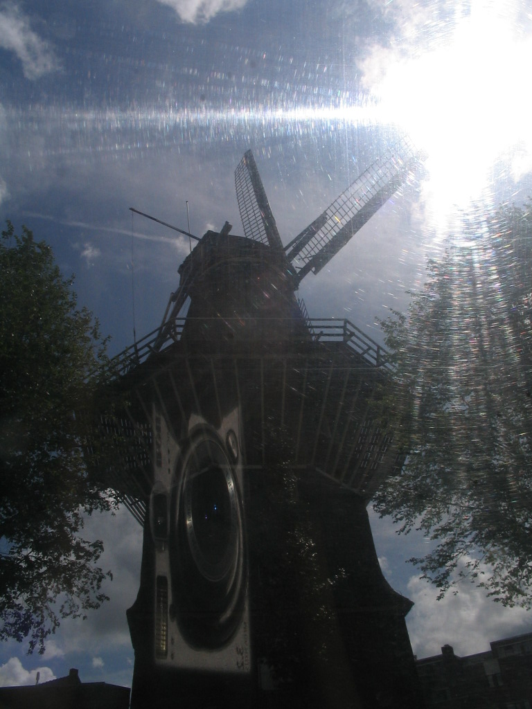 A solarified glimpse of the windmill De Gooyer as we proceeded from the Lozingskanaal into the Nieuwevaart, both of which are canals threading through the eastern part of the city.