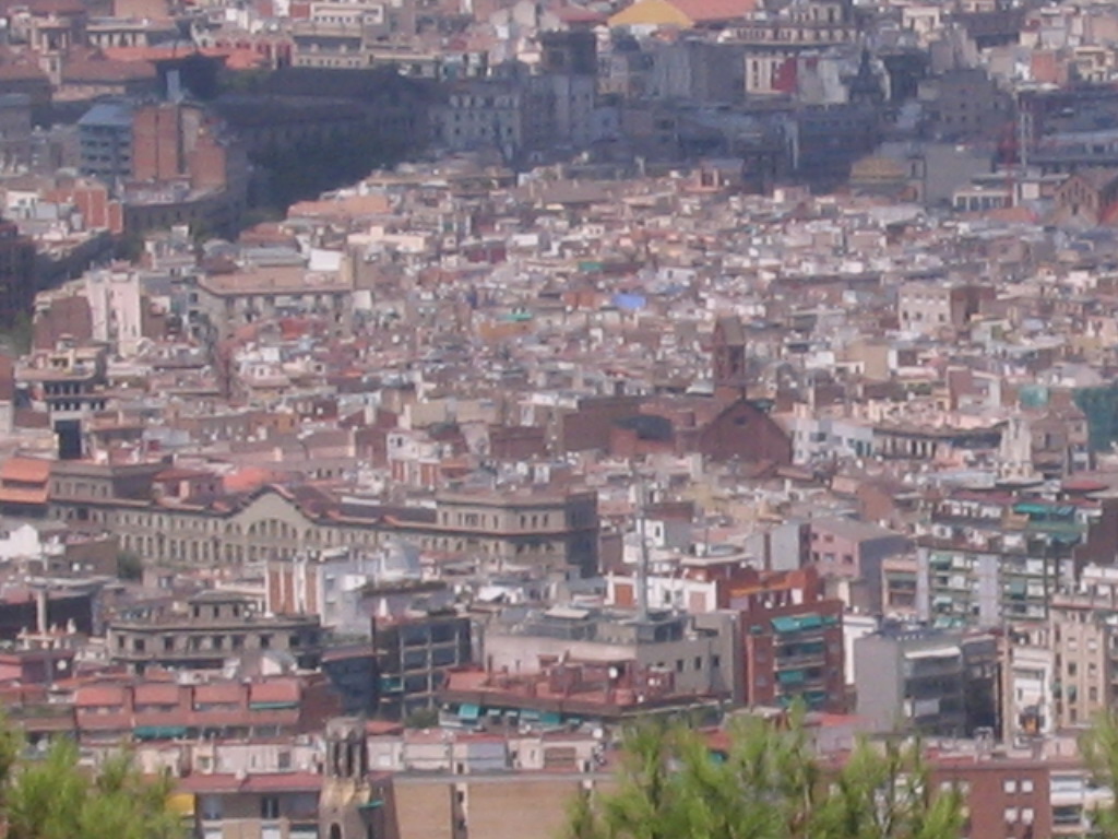 With the camera zoom only: a distant cloud shadow, the Parròquia, and that big building along Ronda de Sant Pau.
