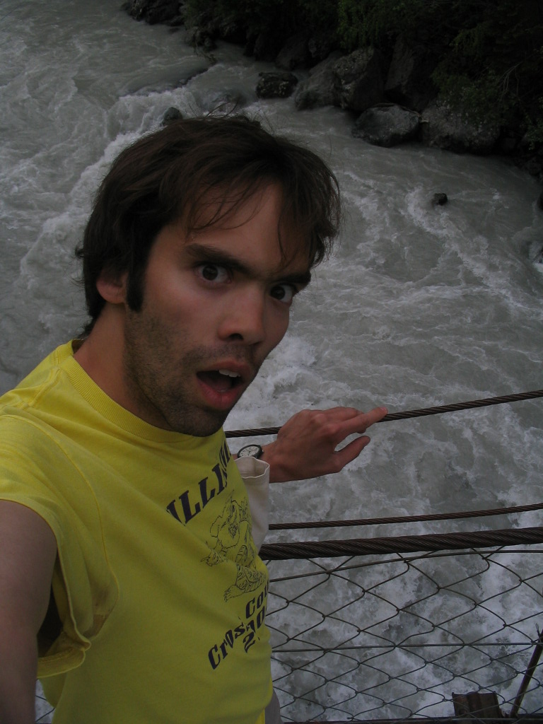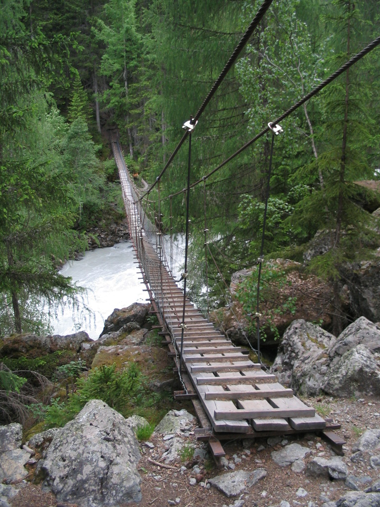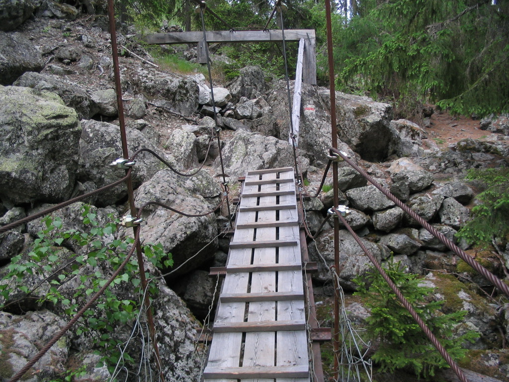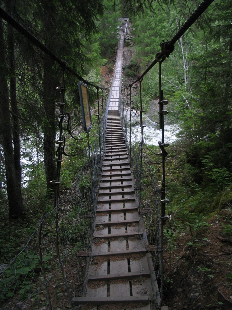 The full bridge. I wonder what that sign at left says. I wonder if I even noticed it when I was there. (Edit: well, obviously it's a warning sign — a big red-and-white triangle is easily visible on it. Inside the triangle appears perhaps to be a stick figure falling toward a watery demise.)