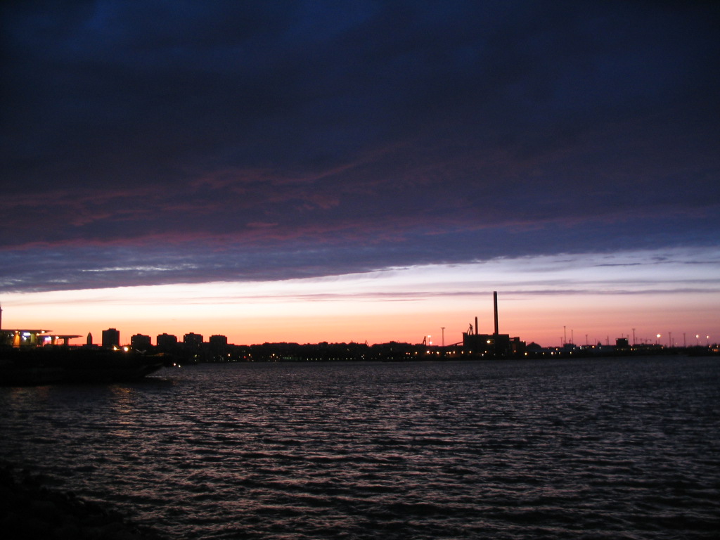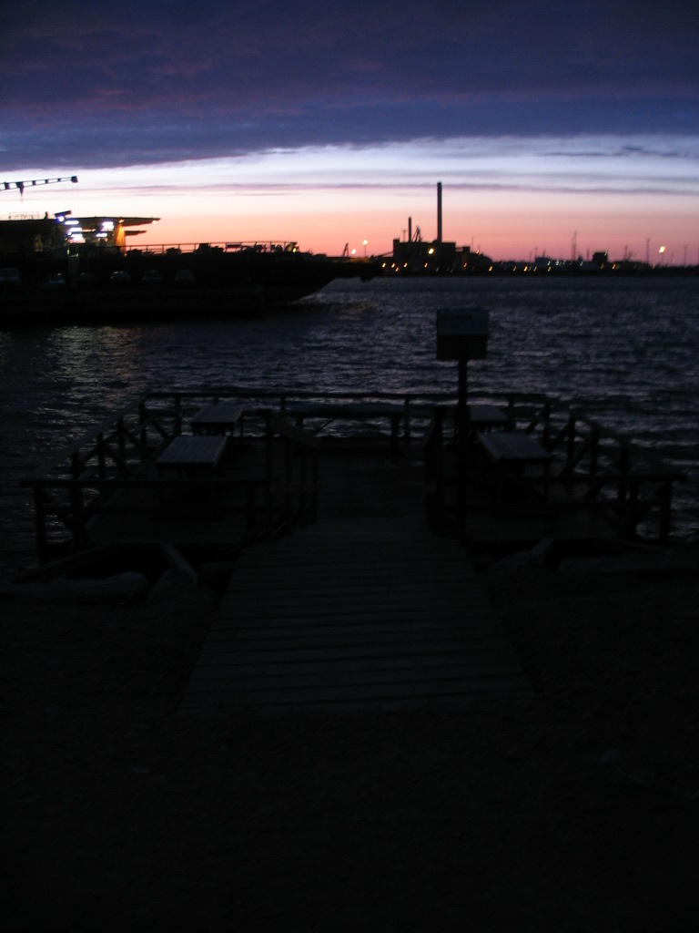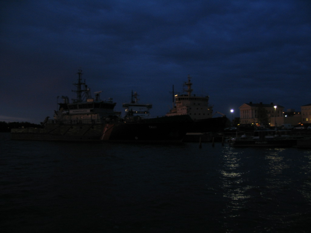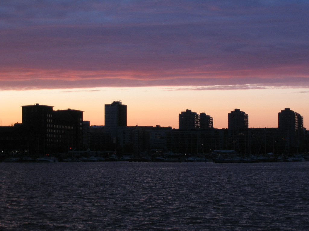 The view out toward Hanasaari, twilight still bright below the clouds.
