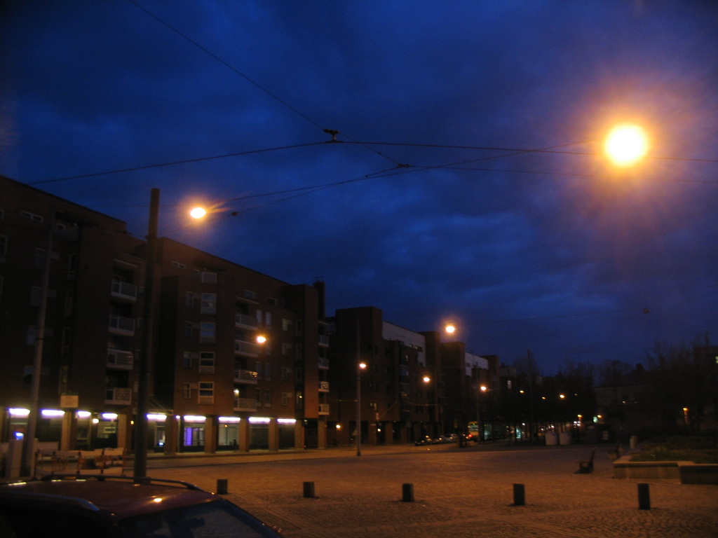 Twilight still bright near the northern horizon, accompanied by firefly-like streetlights.