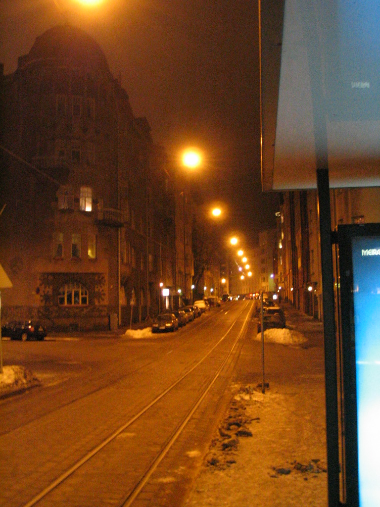 Nighttime view along Tehtaankatu ("Factory St") at the tram stop nearby.