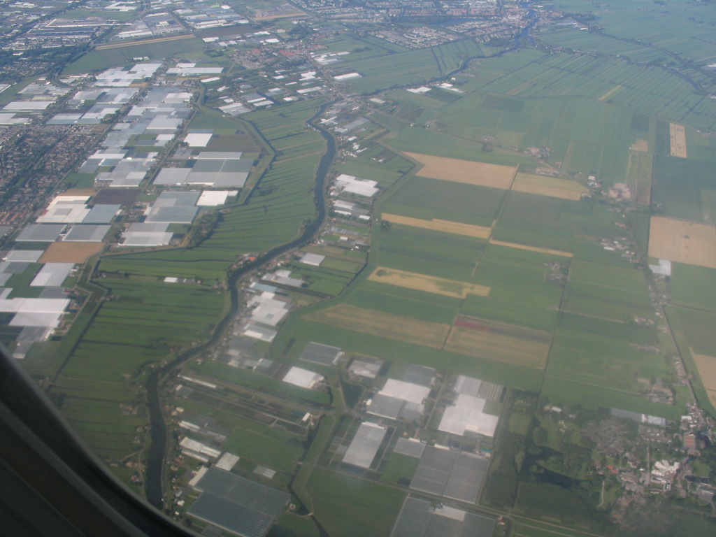 The engineered Dutch landscape is a wonder to behold from the air. I'm confused as to what all these rectangles that look like computer chips are — greenhouses? factories?