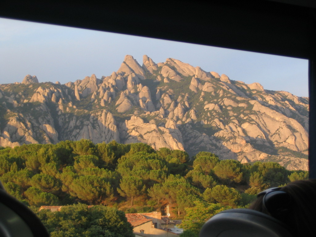 Montserrat in the lowering sun. Those trees below it in the middleground are cute.