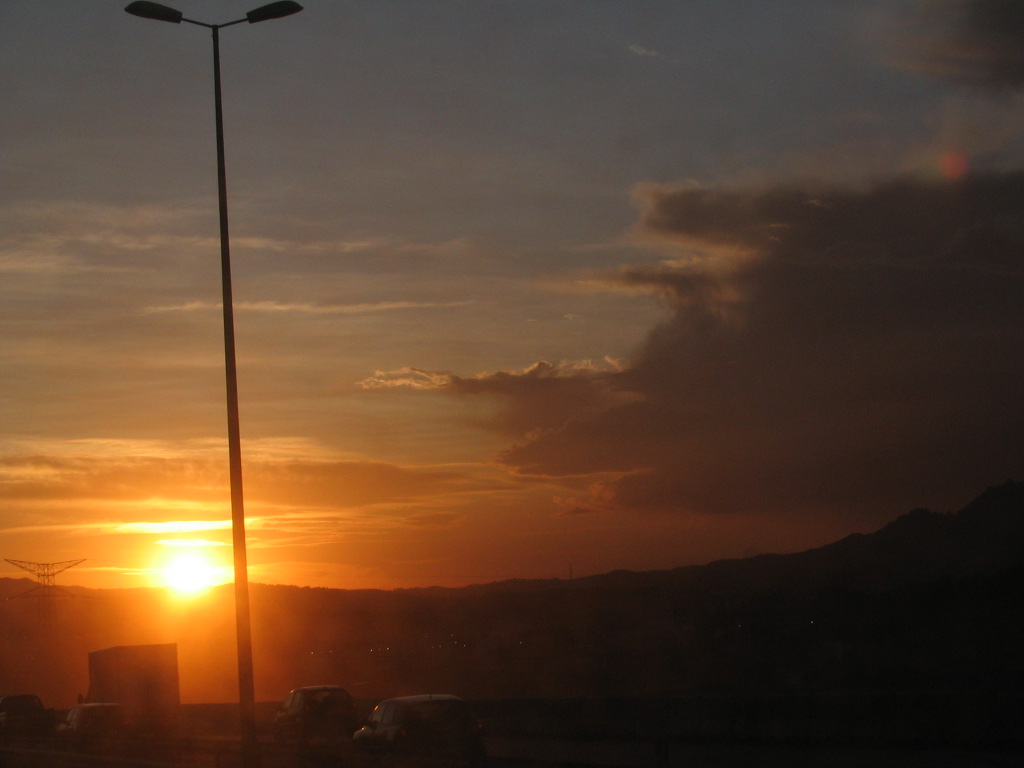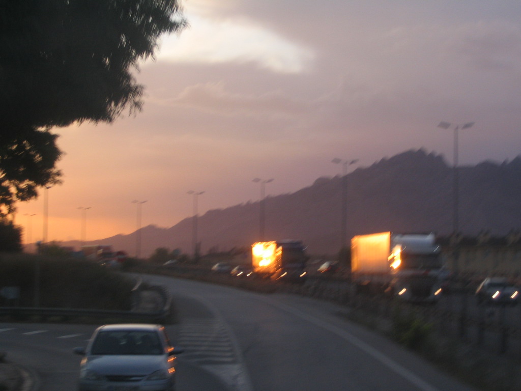 Trucks scooping up the last bits of sun and then reflecting it off the car just behind us.
