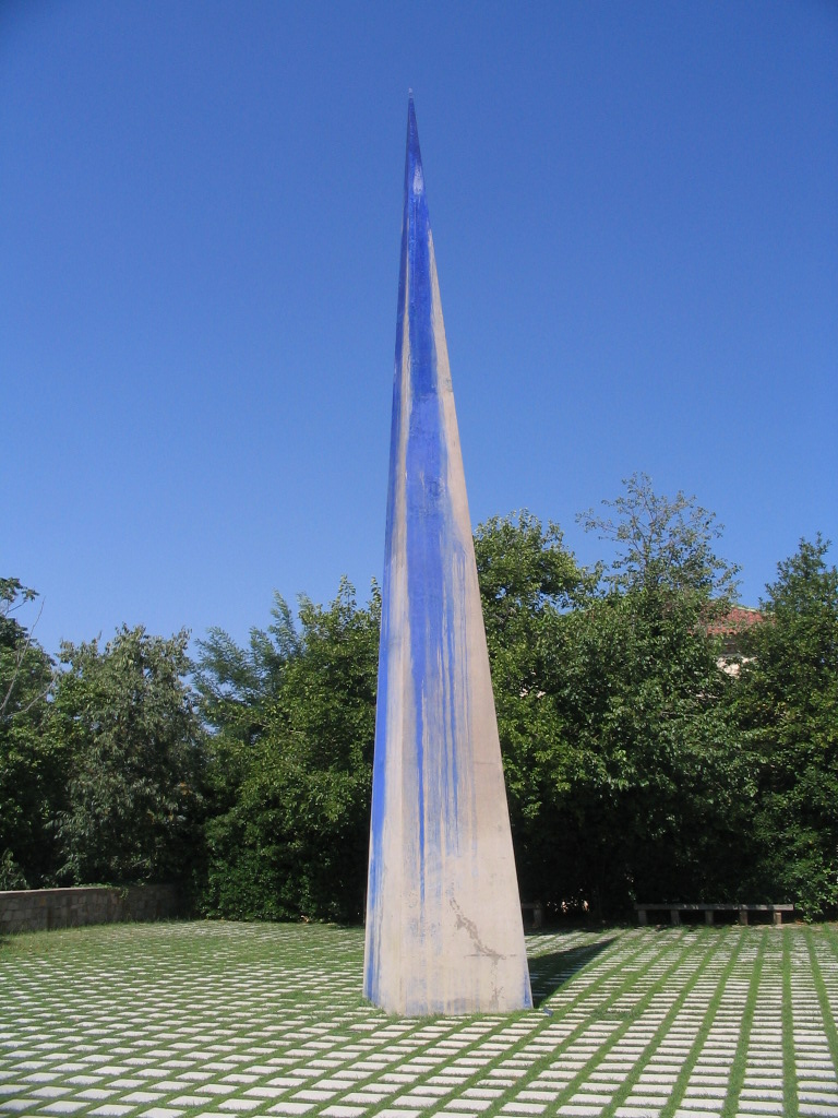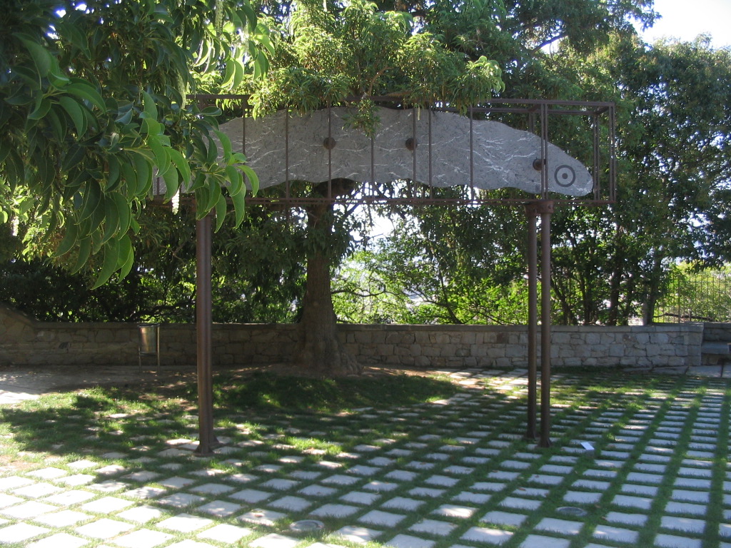 To the northwest, above the stairs and terraces from the first photo, is a courtyard open to the superb mountainward view. This is Lune, soleil et une étoile (1968), its own spireness complimenting the mountain towers.