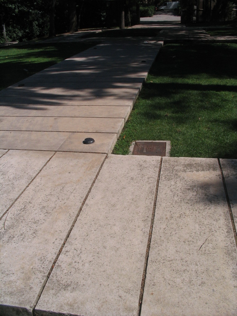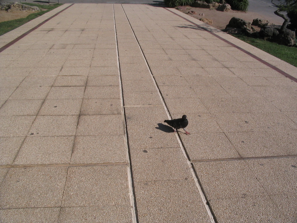 On the way out, a striding pidge in front-right sunlight that turns the patio into a de-Chiricoesque plane.