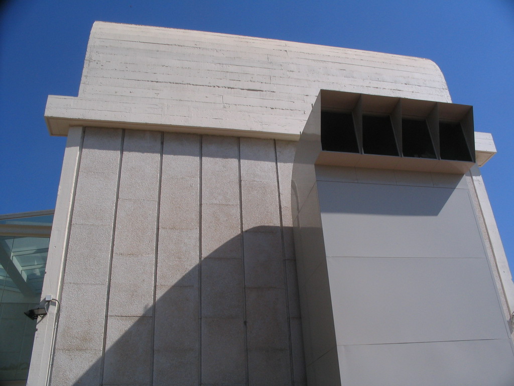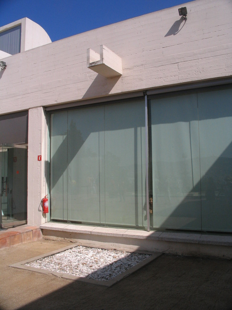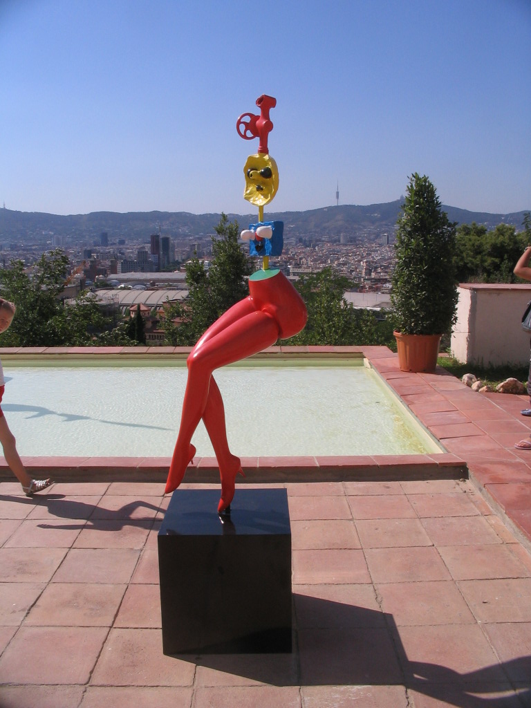 The front entrance, complete with a Catalan-vault-like cantilever, and one of many Personnages (1970) at right.
