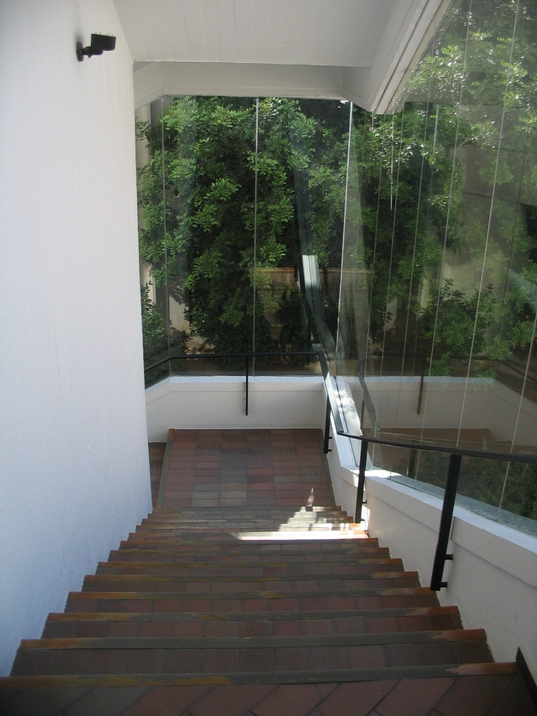 Back down the corner stairs, looking almost immersed in the lush vegetation outside.