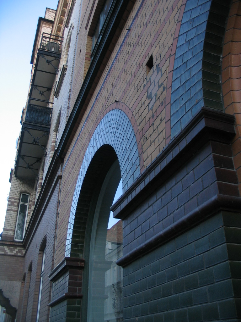I really like the contrast between matte and glossy bricks on this building, along with the color contrast; it adds an unusual and lovely emphasis to the arches. Of course, this was not the first time I'd seen matte and glossy bricks together.
