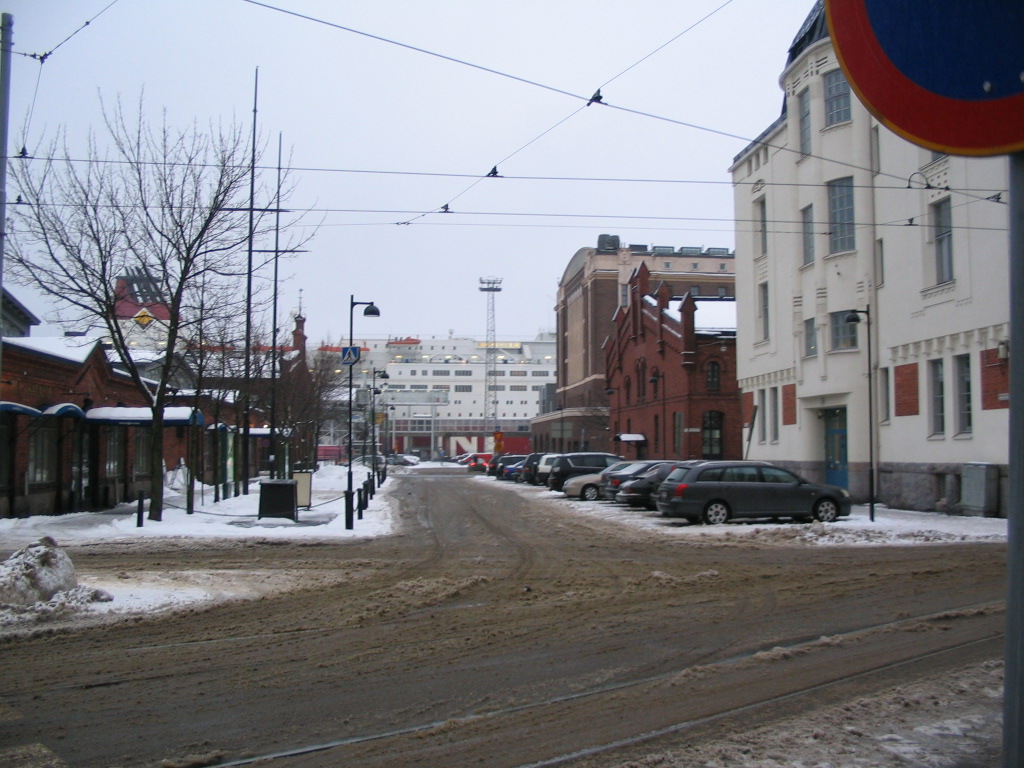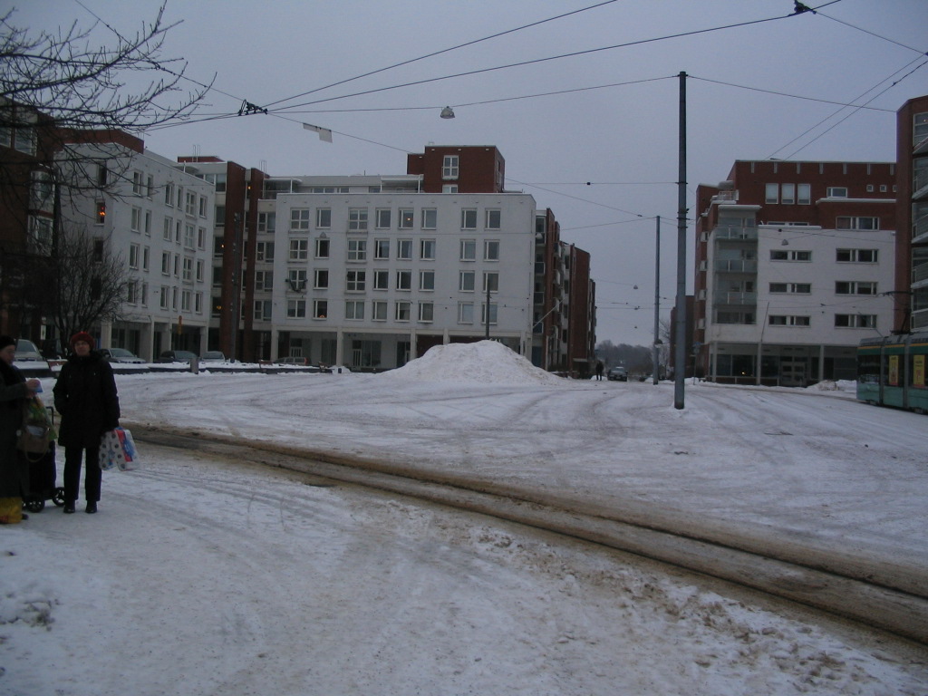 1/22/2014, 11:35 PM: On the very night of the fifth anniversary of my transatlantic flight, in looking up when exactly the trip started, I have discovered a forgotten folder of photos from a walk my roommates and I took from our apartment to the center of town on 1/25/09. This and the following ten pictures are selected from them. Here, a view of our apartment block (left) and the square, Merisotilaantori ("Seaman's Square"), that it faces. Also: an excellent plowmountain.