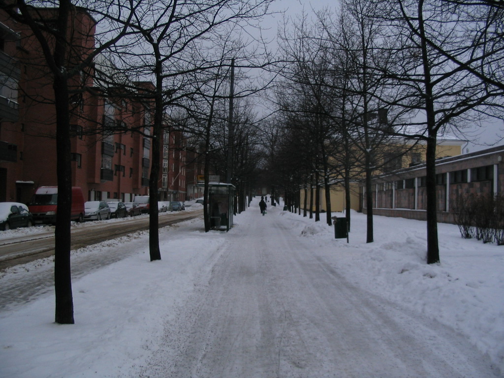 Heading up the sidewalk along the street, Merikasarminkatu ("Naval Barracks St"), that leads toward the city center from the square. (More like a side-snowmobile at this point.)