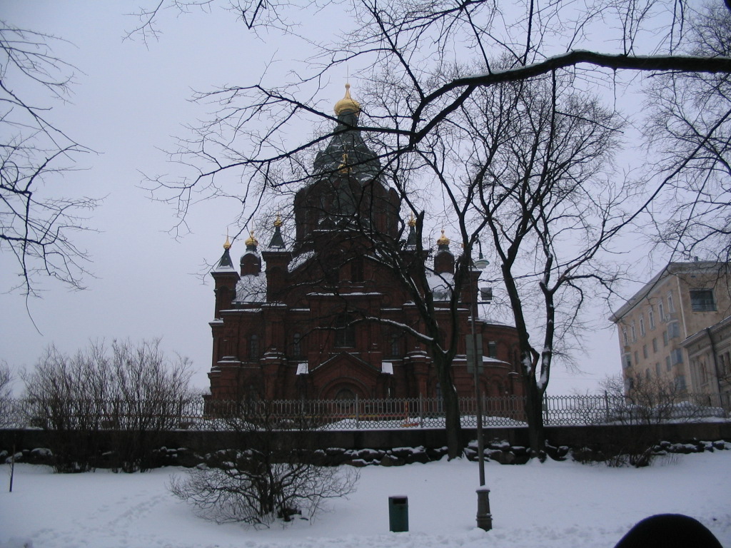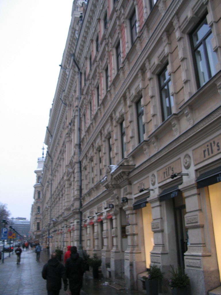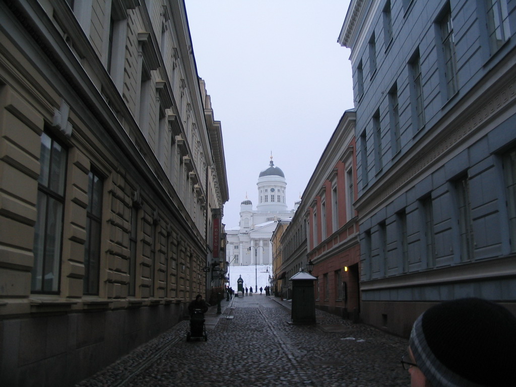 While proceeding along Pohjoisesplanadi ("North Esplanade"), we gleaned a ghostly glimpse of the (Lutheran) Helsinki Cathedral (Helsingin tuomiokirkko) via Sofiankatu.