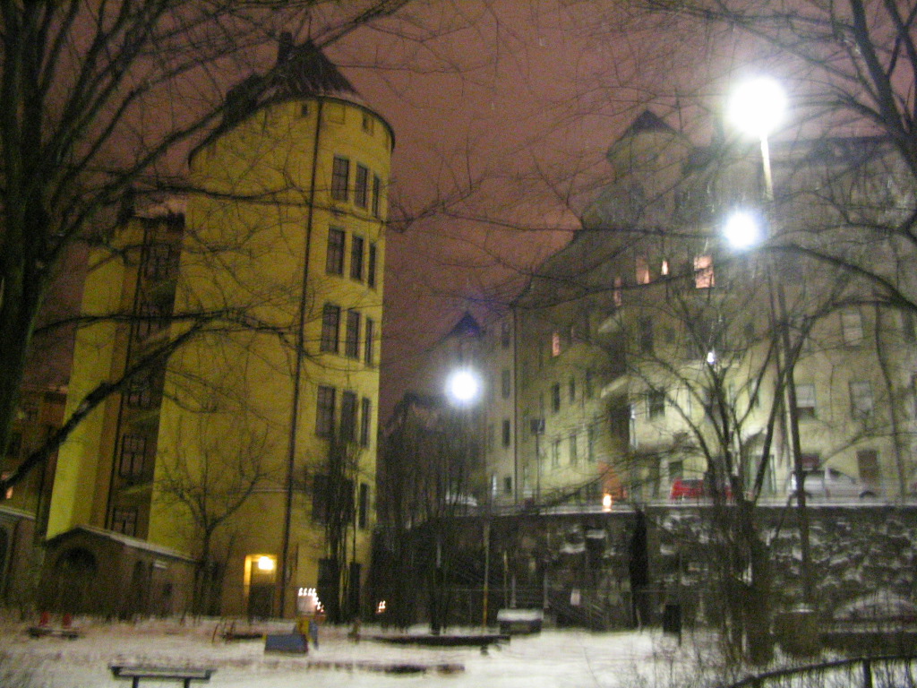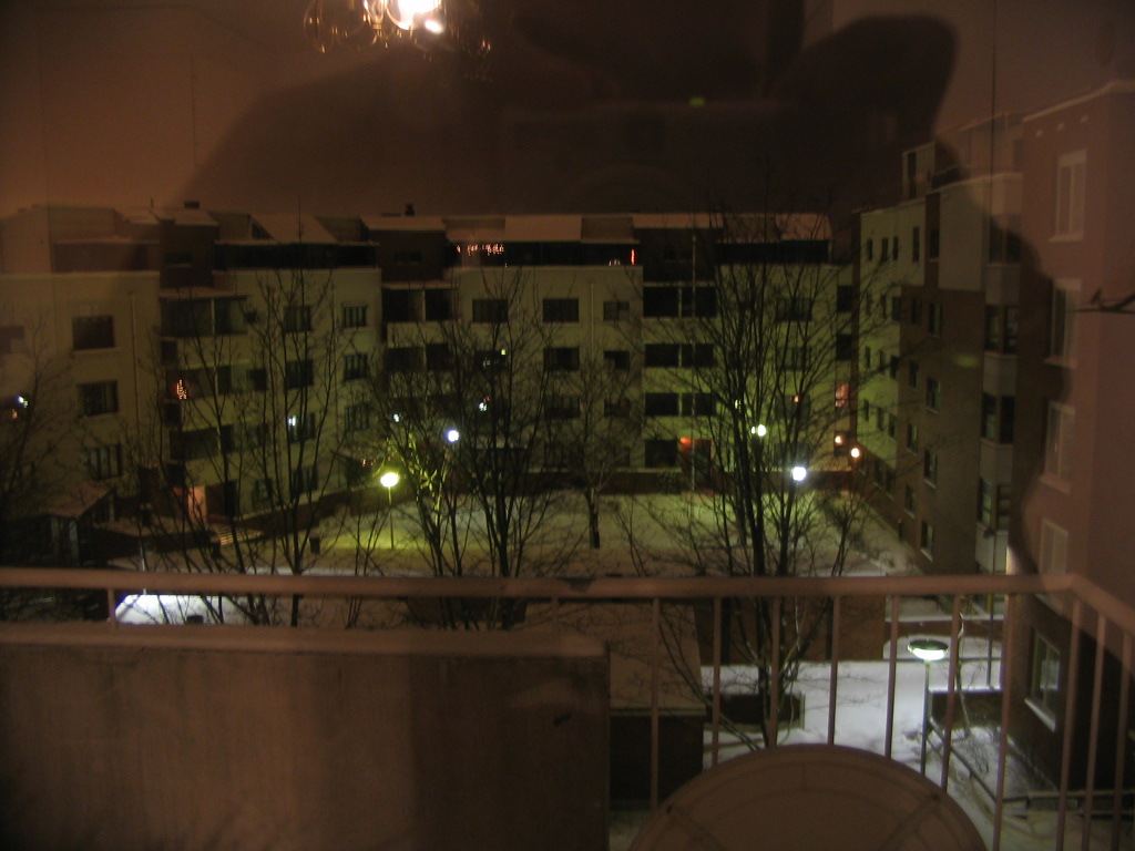 The view out to the balcony outside my bedroom and the courtyard beyond. These conditions (snowy, dark, and cloudy) typified the first week there.