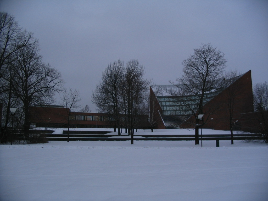 First glimpse of the main building at Teknillinen Korkeakoulu, or TKK for short — in English, Helsinki University of Technology. It's actually in Espoo, though, not Helsinki proper; Espoo is another municipality to the west and northwest of Helsinki. This main building is one of Aalto's iconic designs (completed 1965), many more of which we would encounter over the course of the semester, to my continual delight.