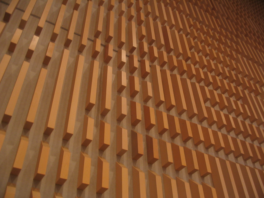 The acoustic treatment on the wall of the main chamber of Helsinki City Hall, which we toured.