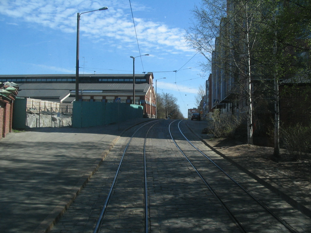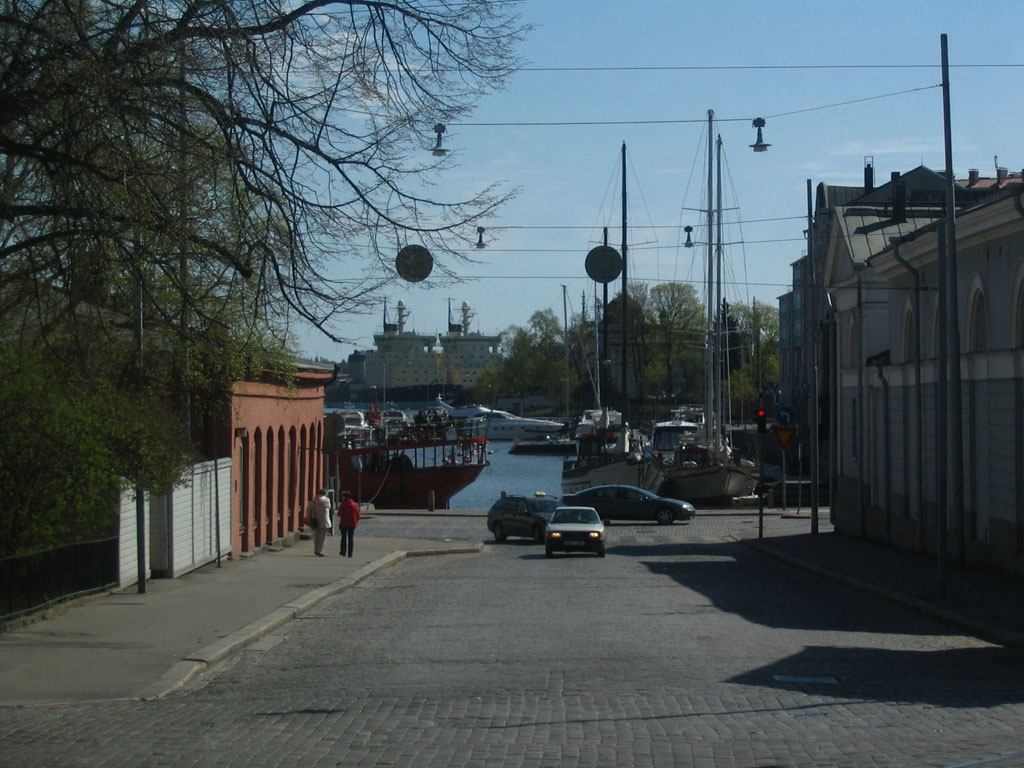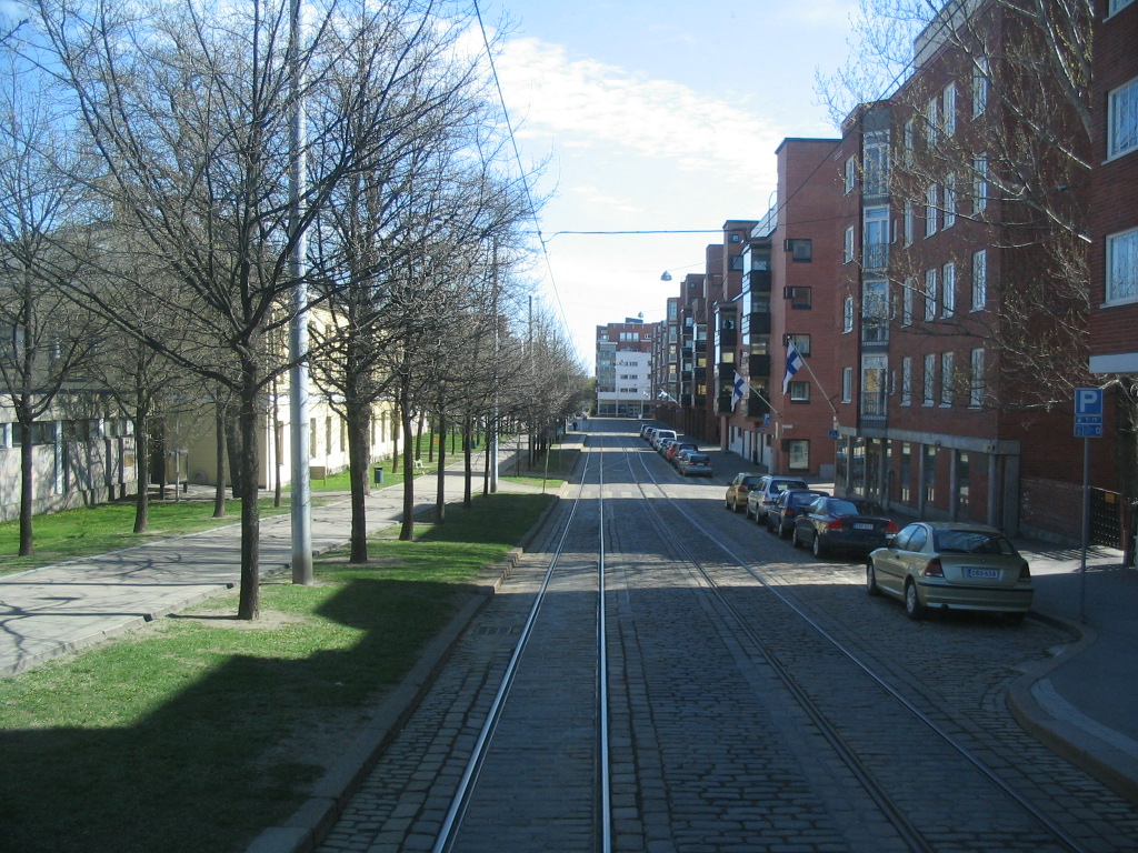 Merisotilaantori receding in the distance at the end of Merikasarminkatu.