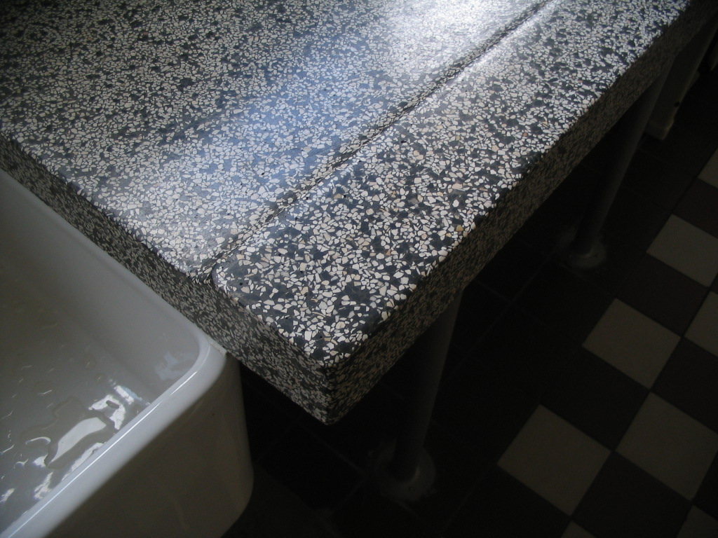 I'm very curious what this countertop material is. It looks like a contemporary resinous composite, like Corian. Maybe it's a sort of terrazzo.