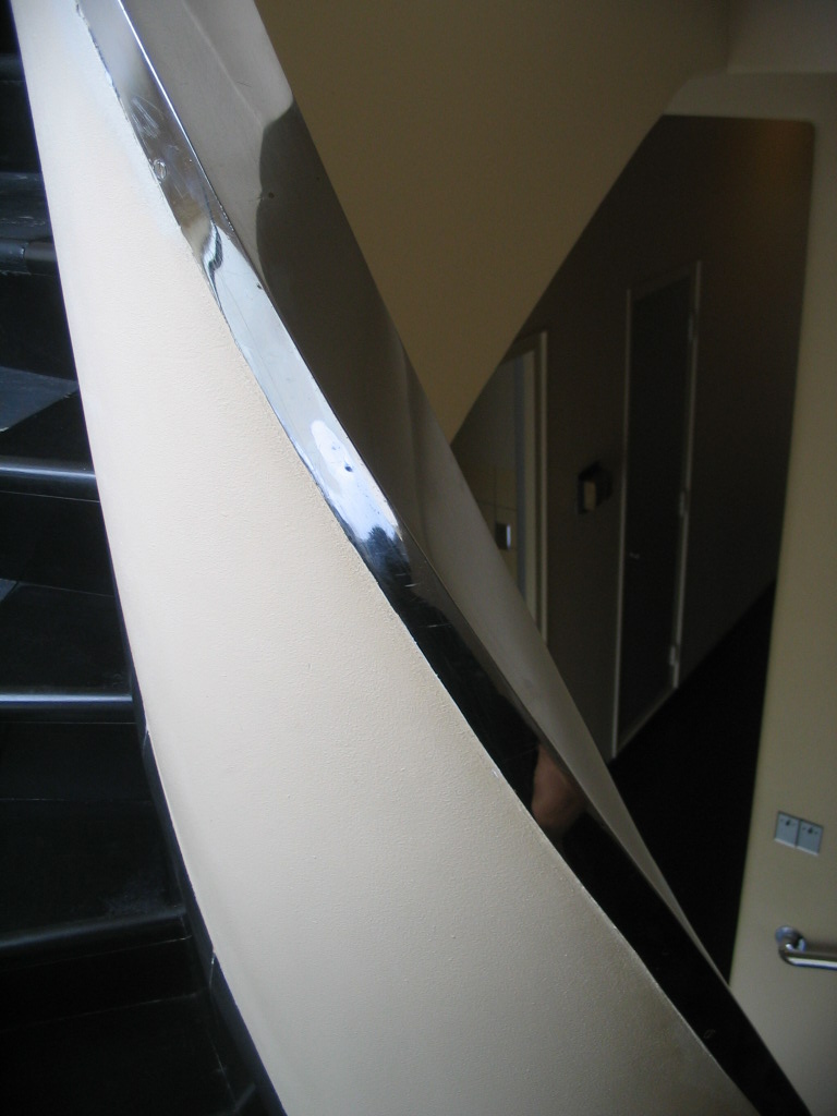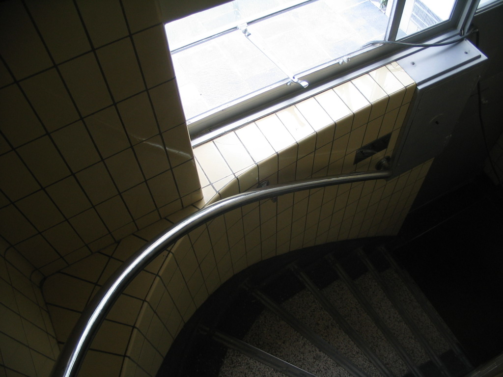 Down the service stairs. It would be fun to hang out in that little niche at left behind the railing, if one were small enough to fit.
