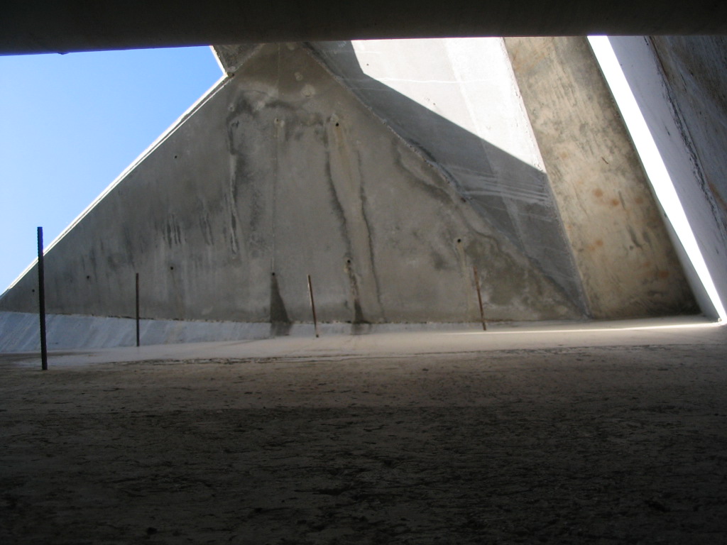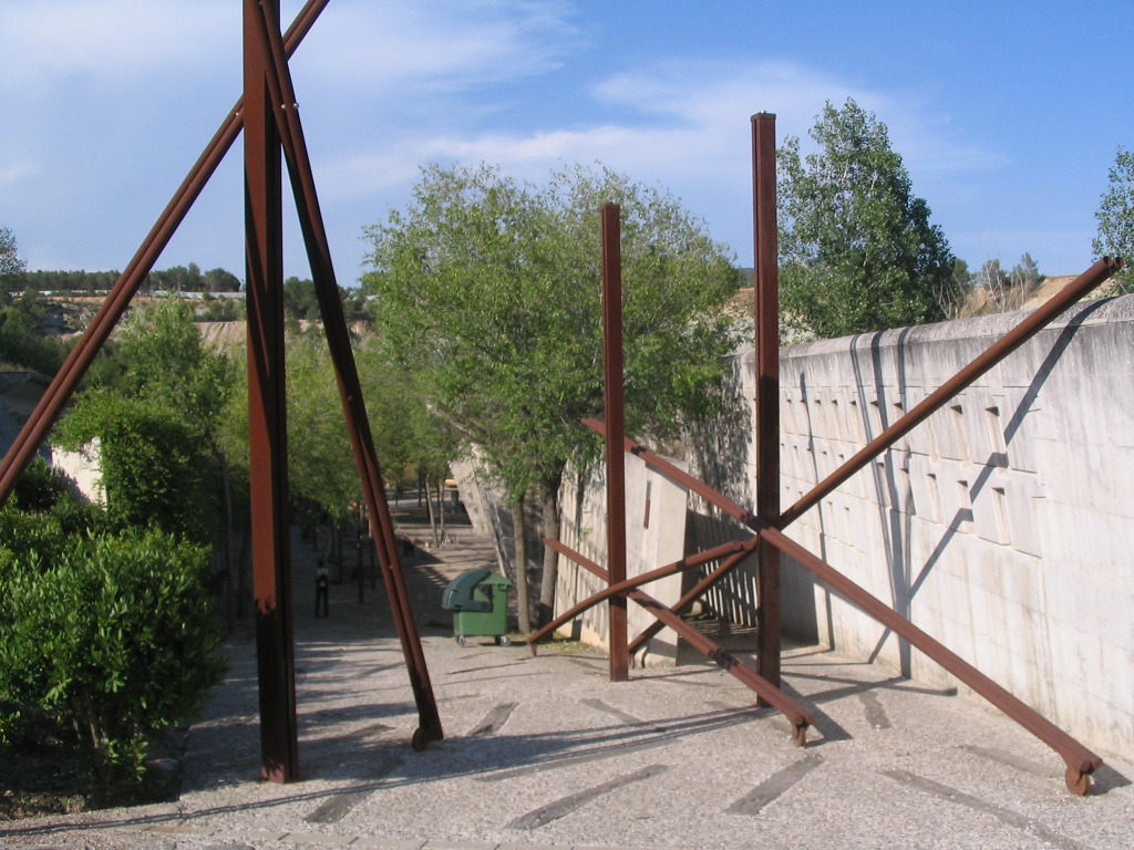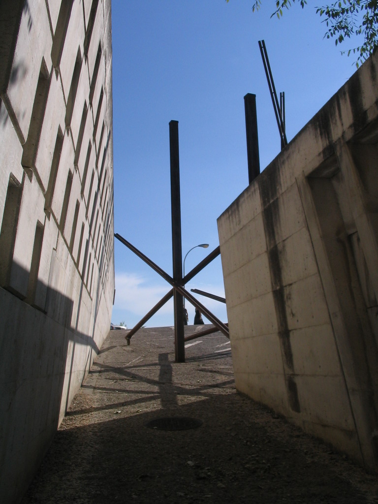 The crossed steel pipes at the upper end of the main walk: note that they're wheeled at their bases and pinned to the posts — I bet this is to allow for expansion and contraction without any of the members forcing each other to distort.