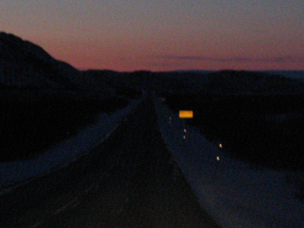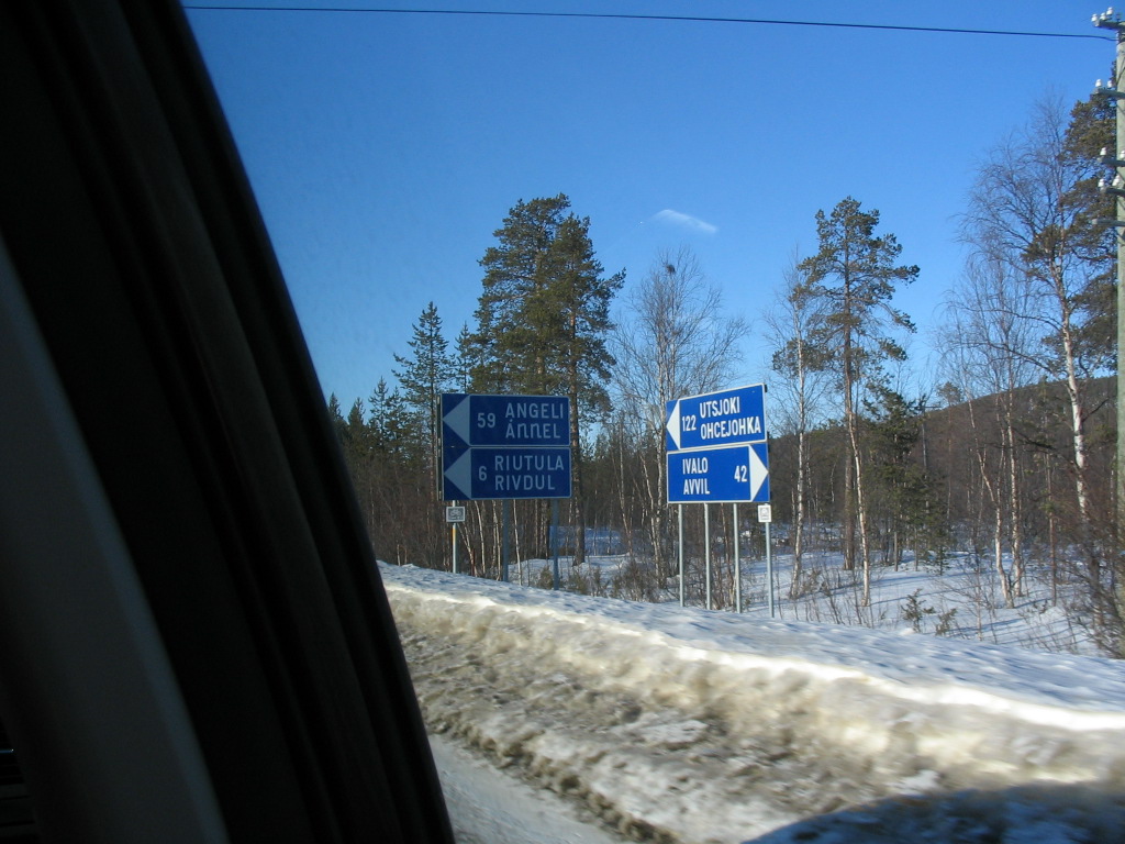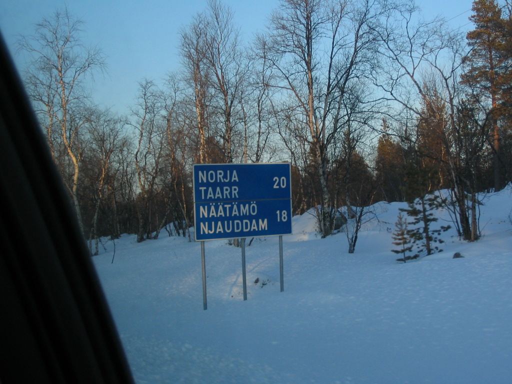 Passing by the sign for the Angeli road toward Vasatokka. The odd symbols in the Sámi name for Angeli are a capitalized version of ŋ, which denotes the "ng" sound in the International Phonetic Alphabet and apparently in the orthography of this Sámi variety.
