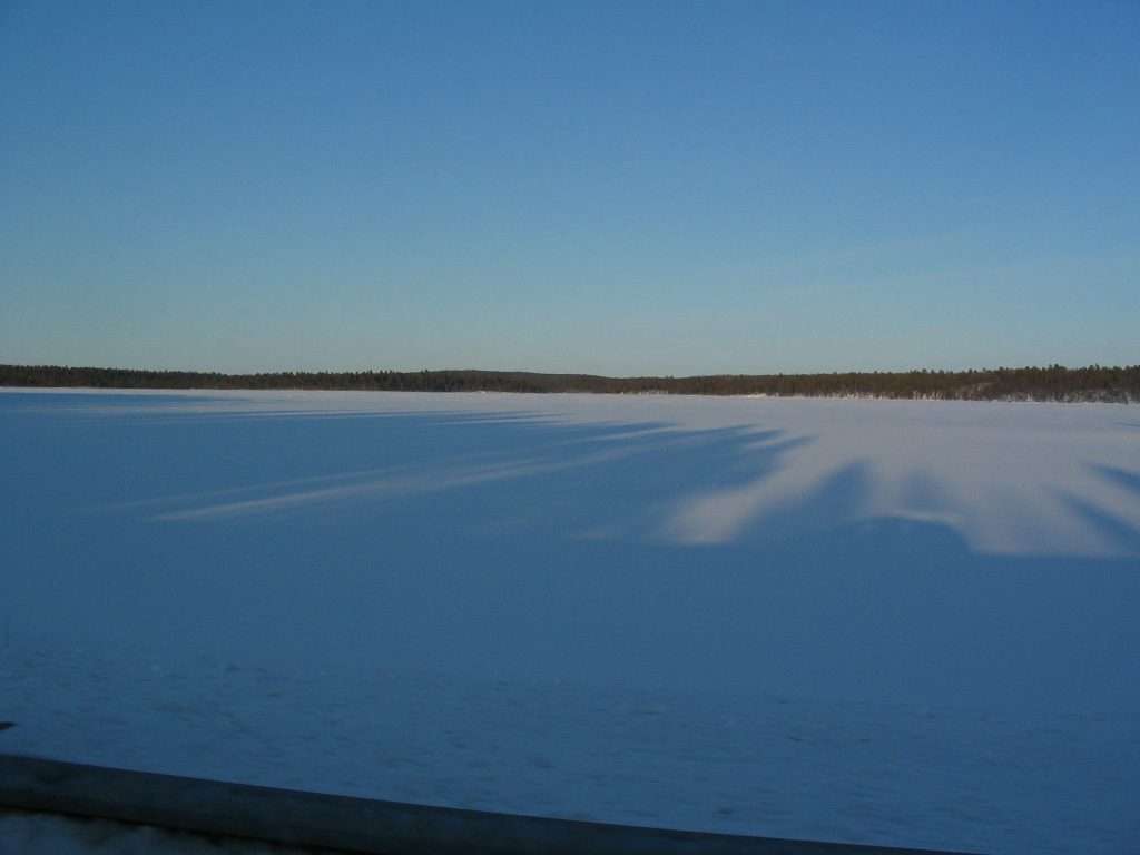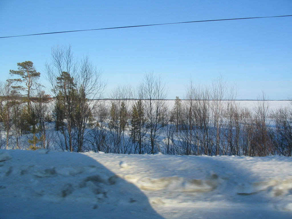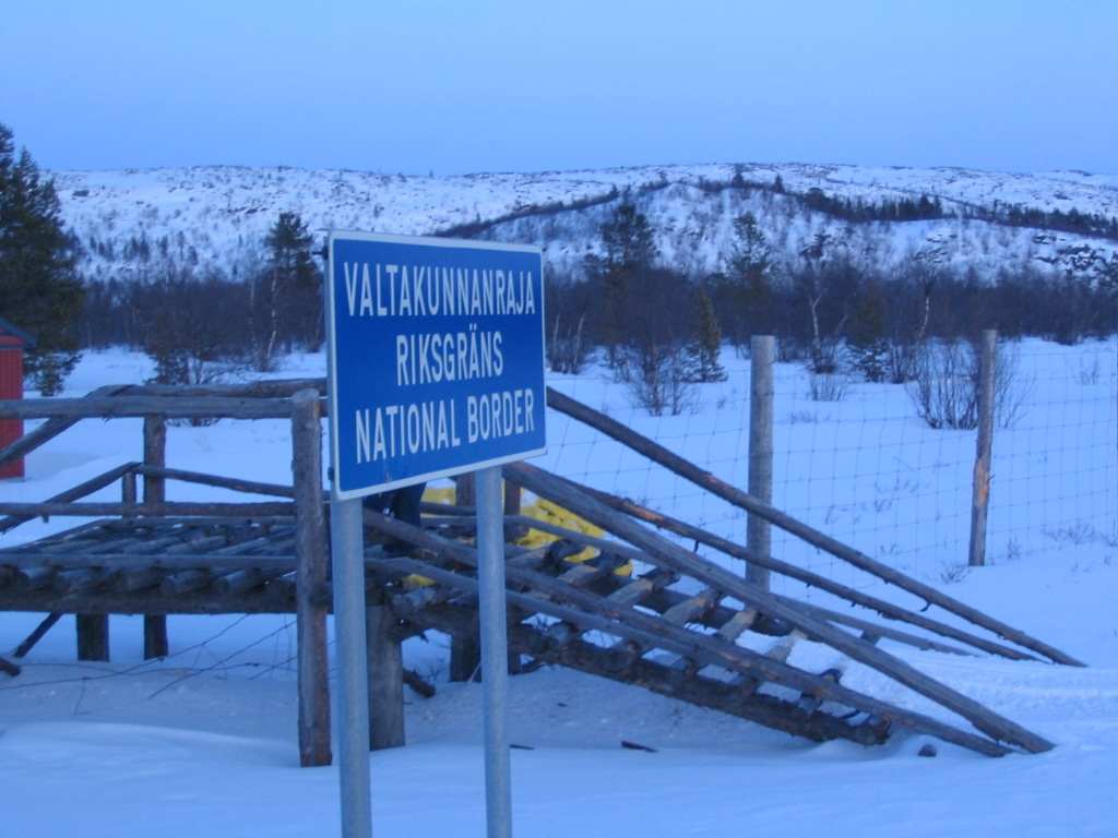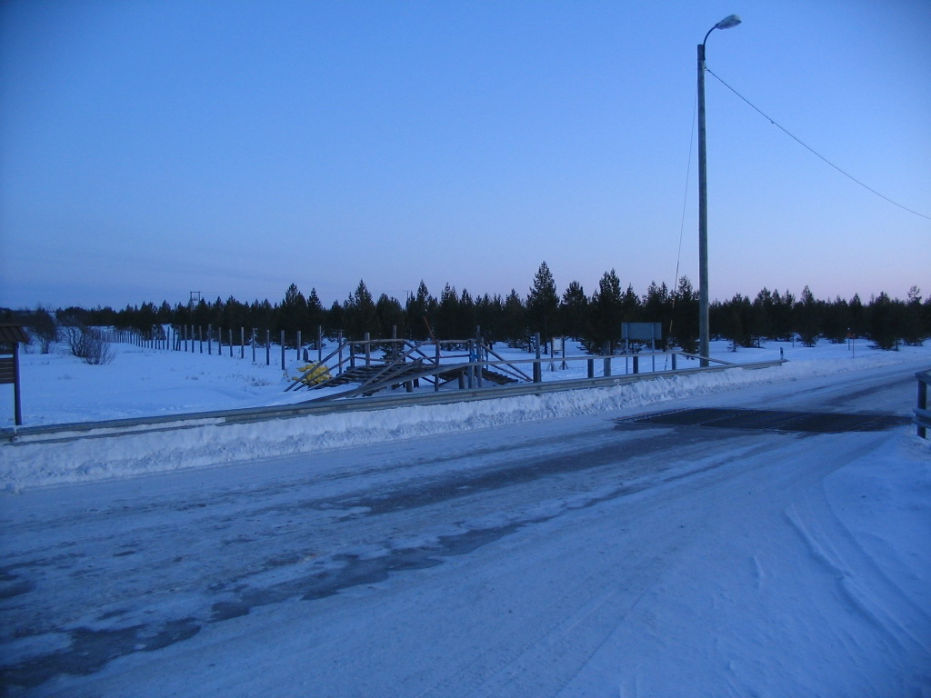 Oh yeah, there we go. I'm not sure what the bridge is all about. UPDATE Jan. 2013: Sources suggest that this is a footbridge to allow people to cross the border on foot, which would otherwise be difficult due to the surface of spaced steel pipes (see previous photo) that are placed in the road to prevent reindeer from crossing. The logs of the bridge are also spaced out to prevent the reindeer from just going over it instead, but they provide a surer tread than the steel pipes in the road. (Thanks Tore!)
