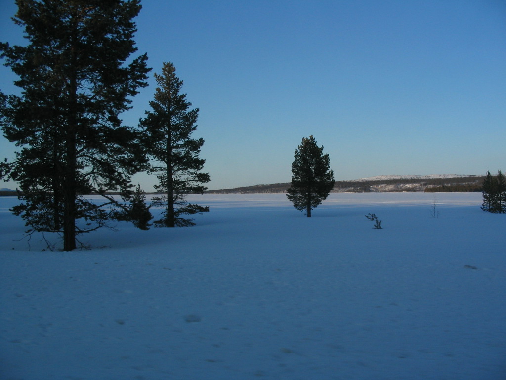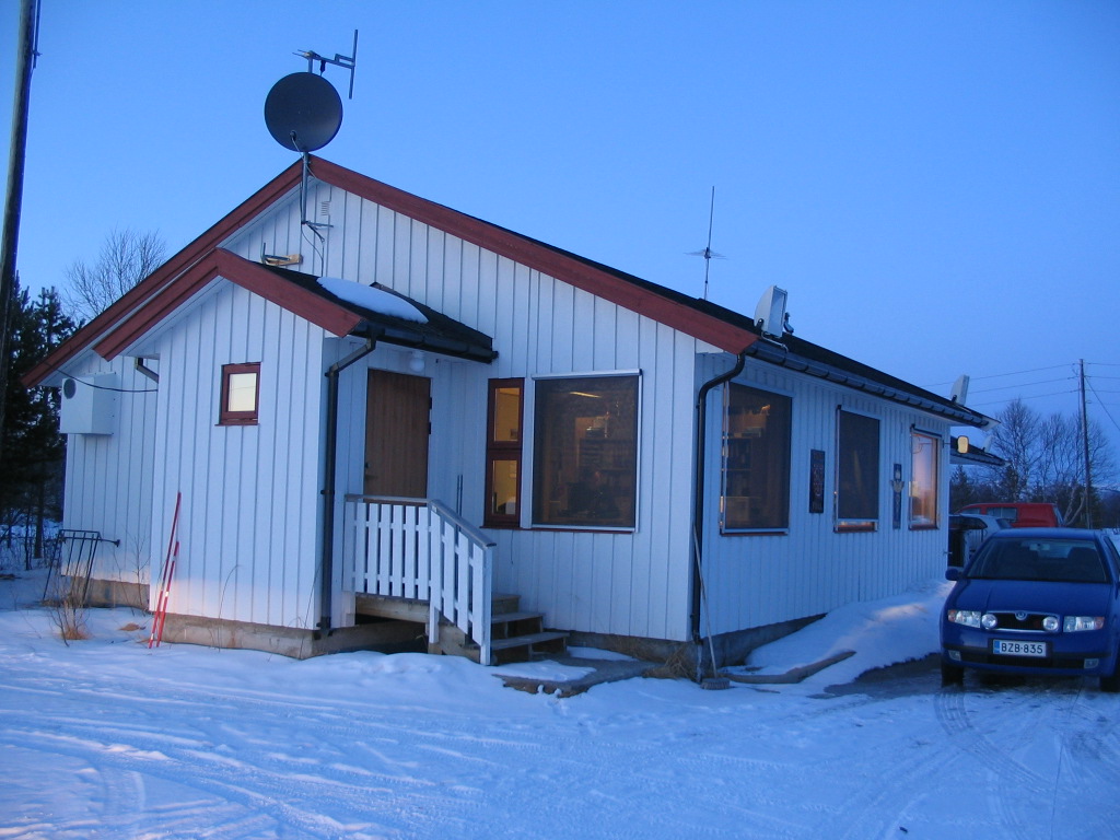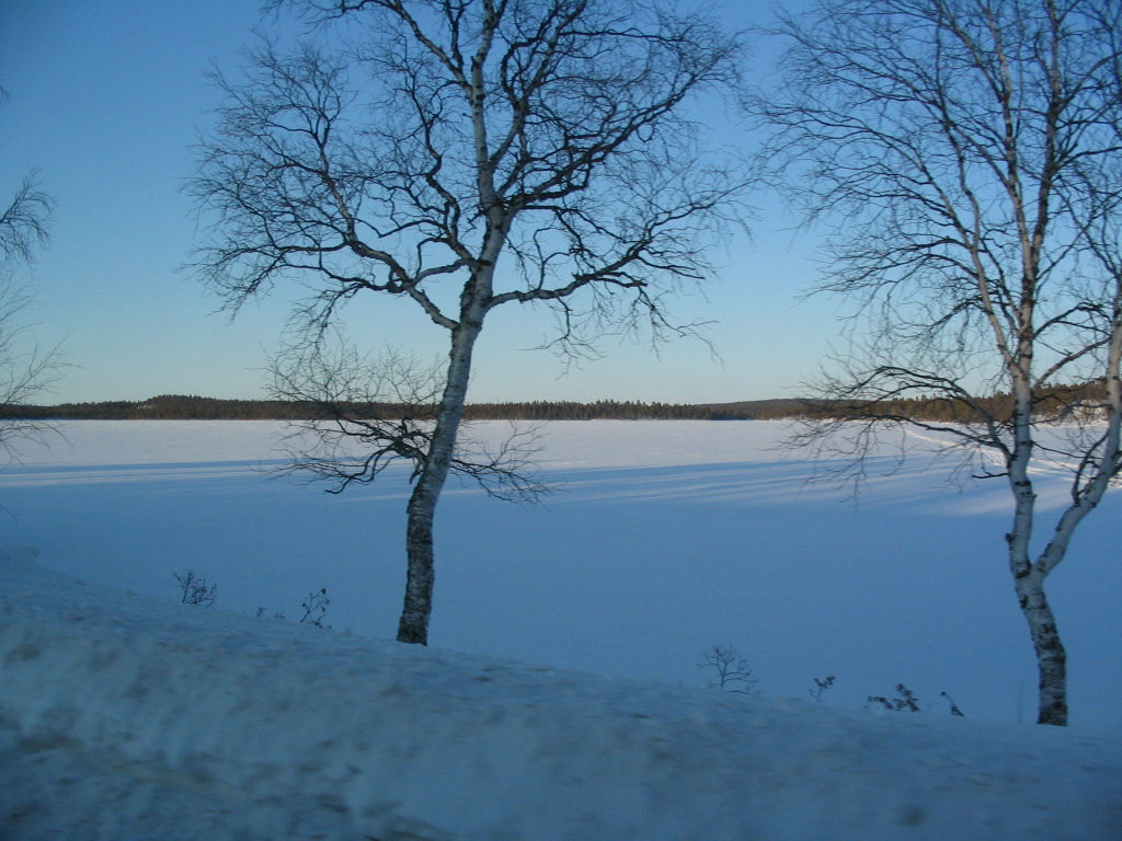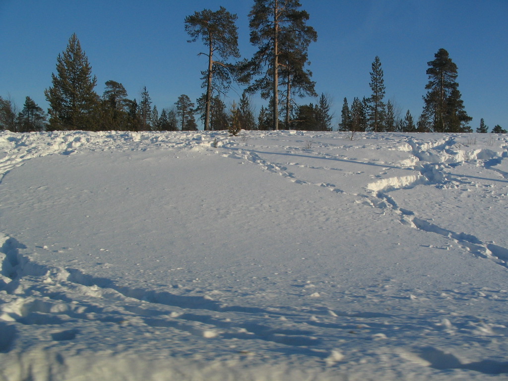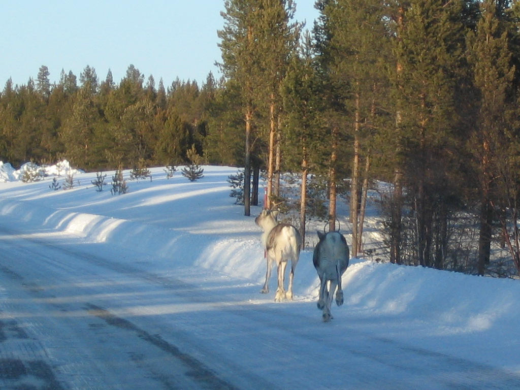 Oh yeah, there we go. I'm not sure what the bridge is all about. UPDATE Jan. 2013: Sources suggest that this is a footbridge to allow people to cross the border on foot, which would otherwise be difficult due to the surface of spaced steel pipes (see previous photo) that are placed in the road to prevent reindeer from crossing. The logs of the bridge are also spaced out to prevent the reindeer from just going over it instead, but they provide a surer tread than the steel pipes in the road. (Thanks Tore!)
