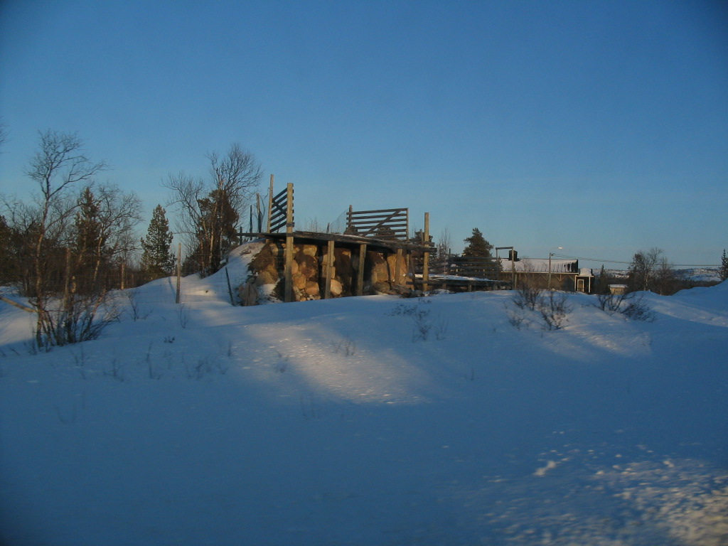 A roadside public concert stage. (Just kidding. I have no idea about this.) — Edit 3/26/2019: looks like there's wire fencing receding from both upper "gates" as well as to the left in foreground, so it seems to be a junction of fenced regions — having to do with reindeer maybe, to keep them in or out? The between-parallel-fences passage seems much like an international no-man's-land, but this is still inside of Finland. The wooden structures also seem similar to those in the border photos below.