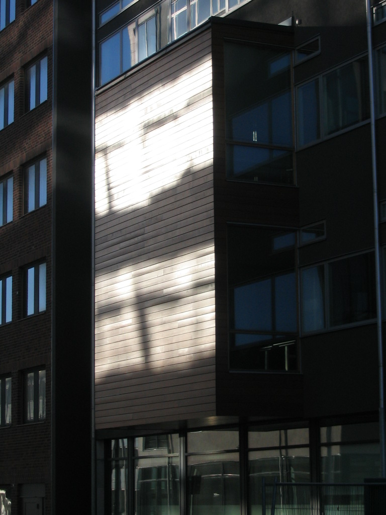 Secondhand sunlight on another wooden bay, on the southern (cityward) side of the same building, reflected off the neighboring building.