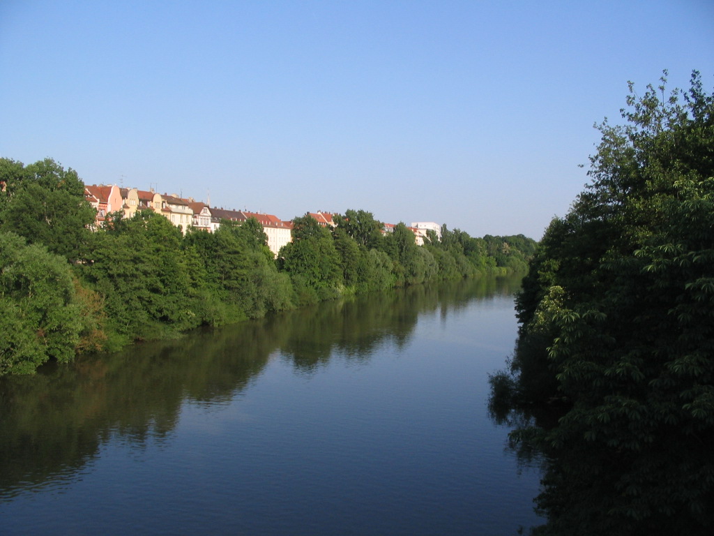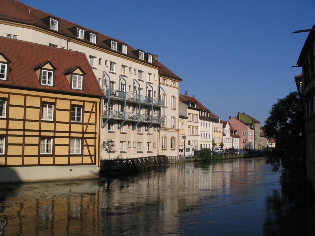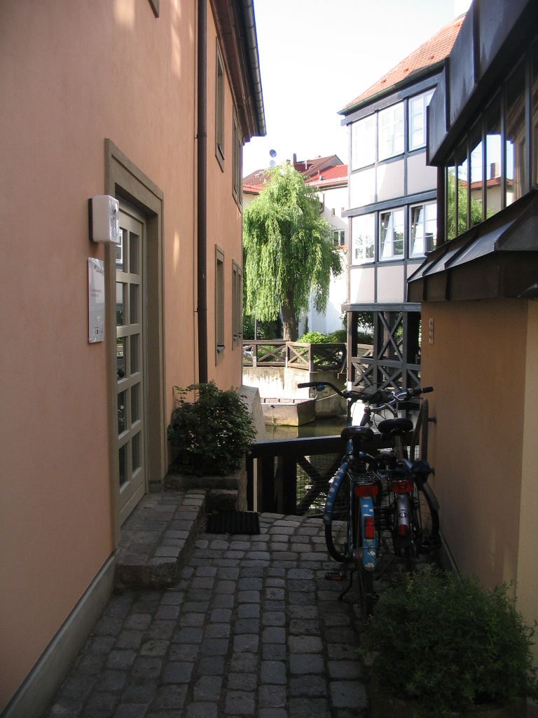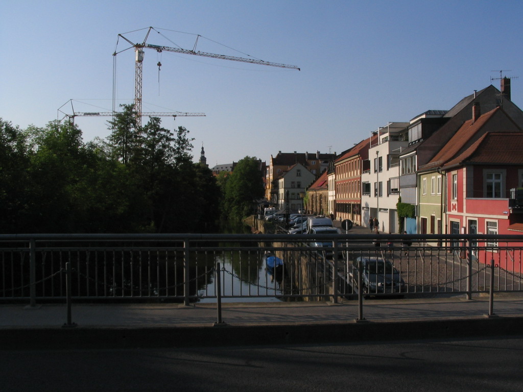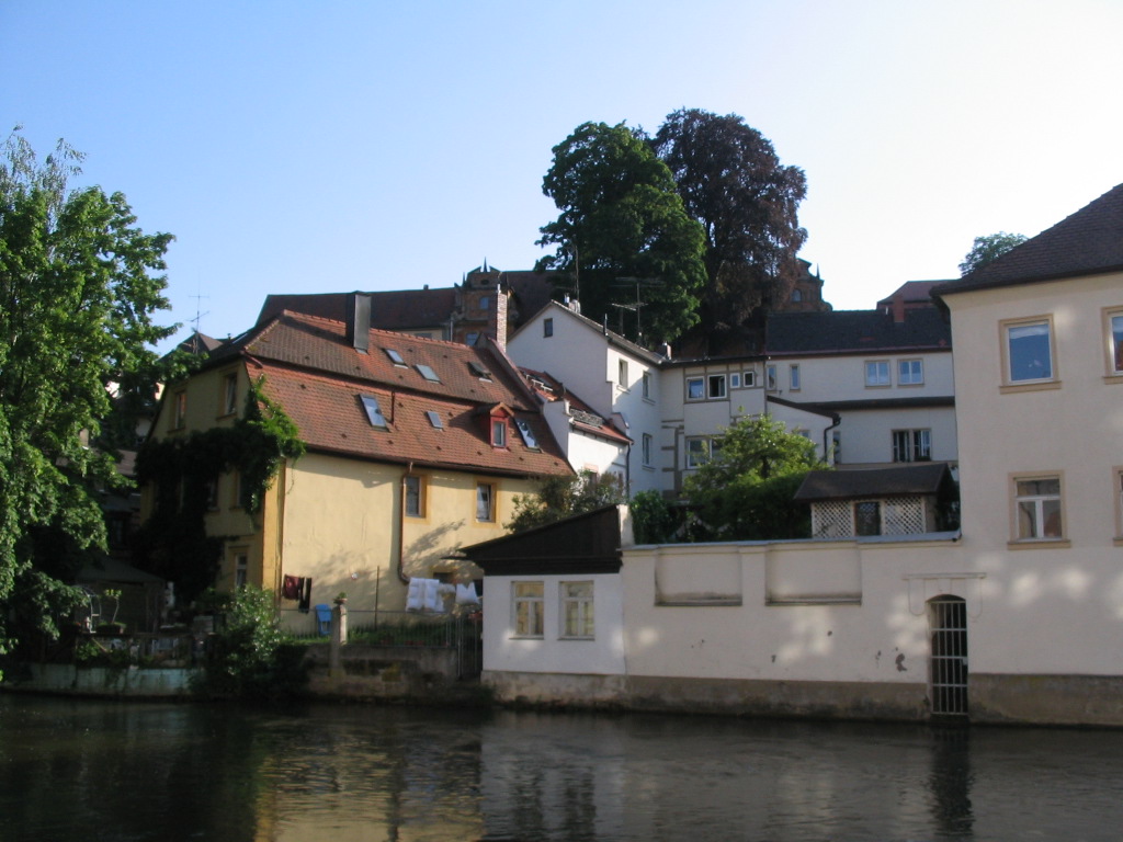 The bank of Inselstadt (actually the island of the Schloss Geyerswörth) seen from the Obere Mühlbrücke, the furthest upstream of the central bridges across the left arm of the Regnitz.