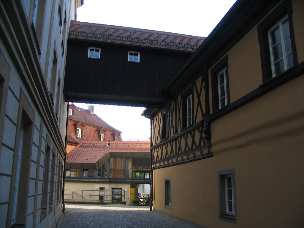 The Mühlwörth street proceeds from the Obere Mühlbrücke under this connecting bridge. Take a look at the right half of the yellow building — ruts where the wooden beams to their left used to continue? That sounds structurally implausible.