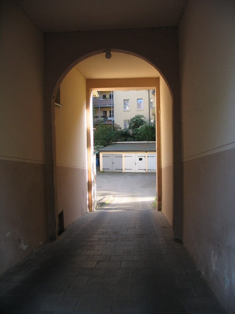 I believe we are peeking back at the above sgraffitoish building through this arcade.
