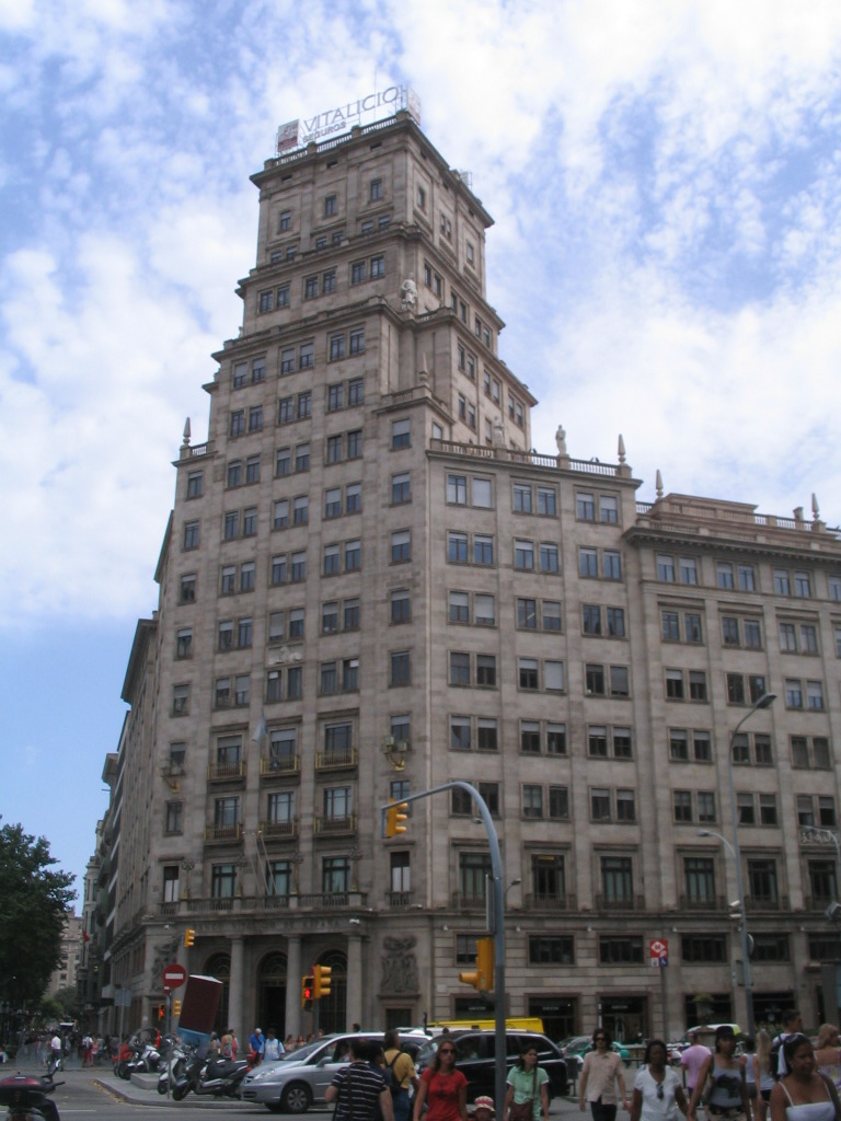 This tower, the Banco Vitalicio, is at the south corner of Passeig de Gràcia and Gran Via de les Corts Catalanes, one of the primary axes of the Eixample.