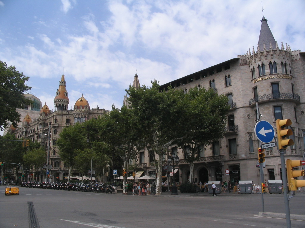 Looking back to the northeastern side of the last block of the Passeig de Gràcia: the sunburst-roofed Casa Rocamora at left and the Casa Pascual i Pons at right.