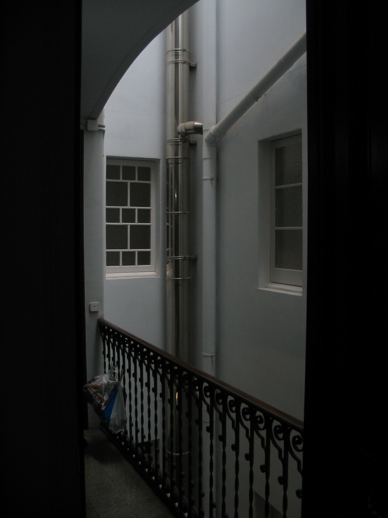 An oblique look into the lightwell from just in front of the elevator by our apartment door.
